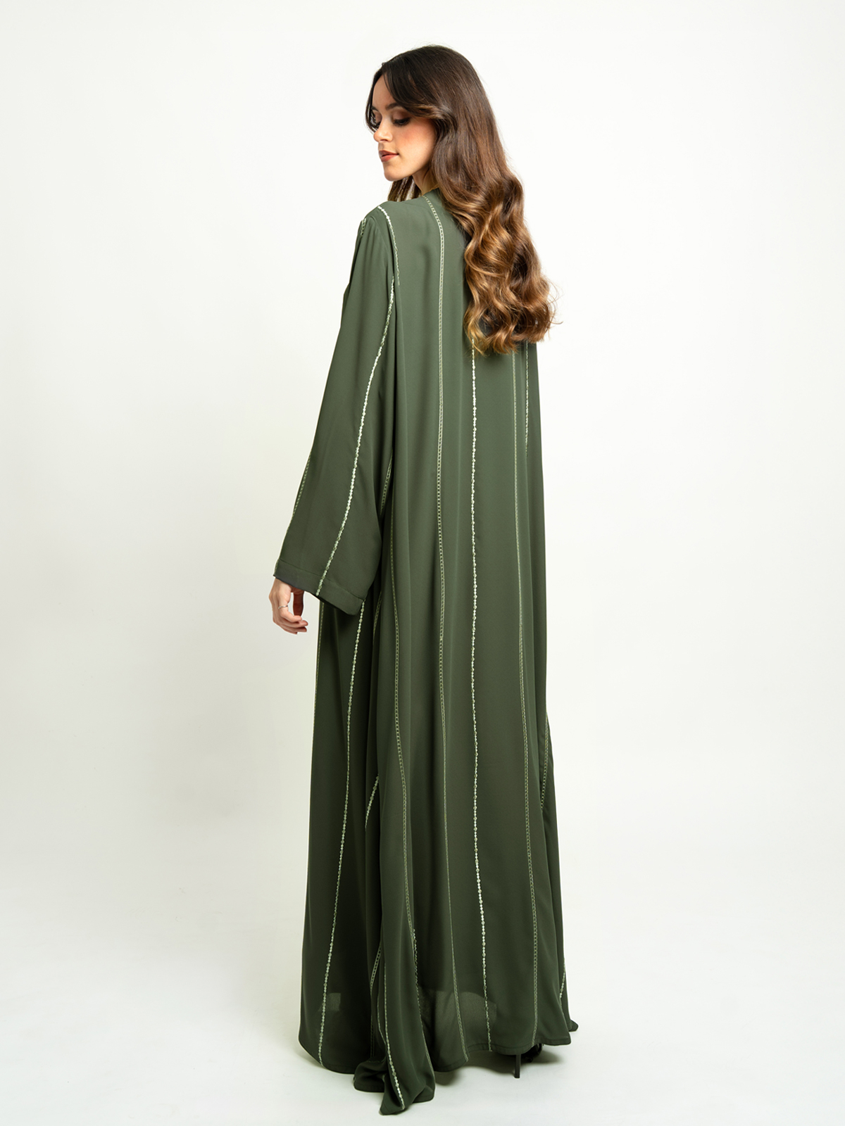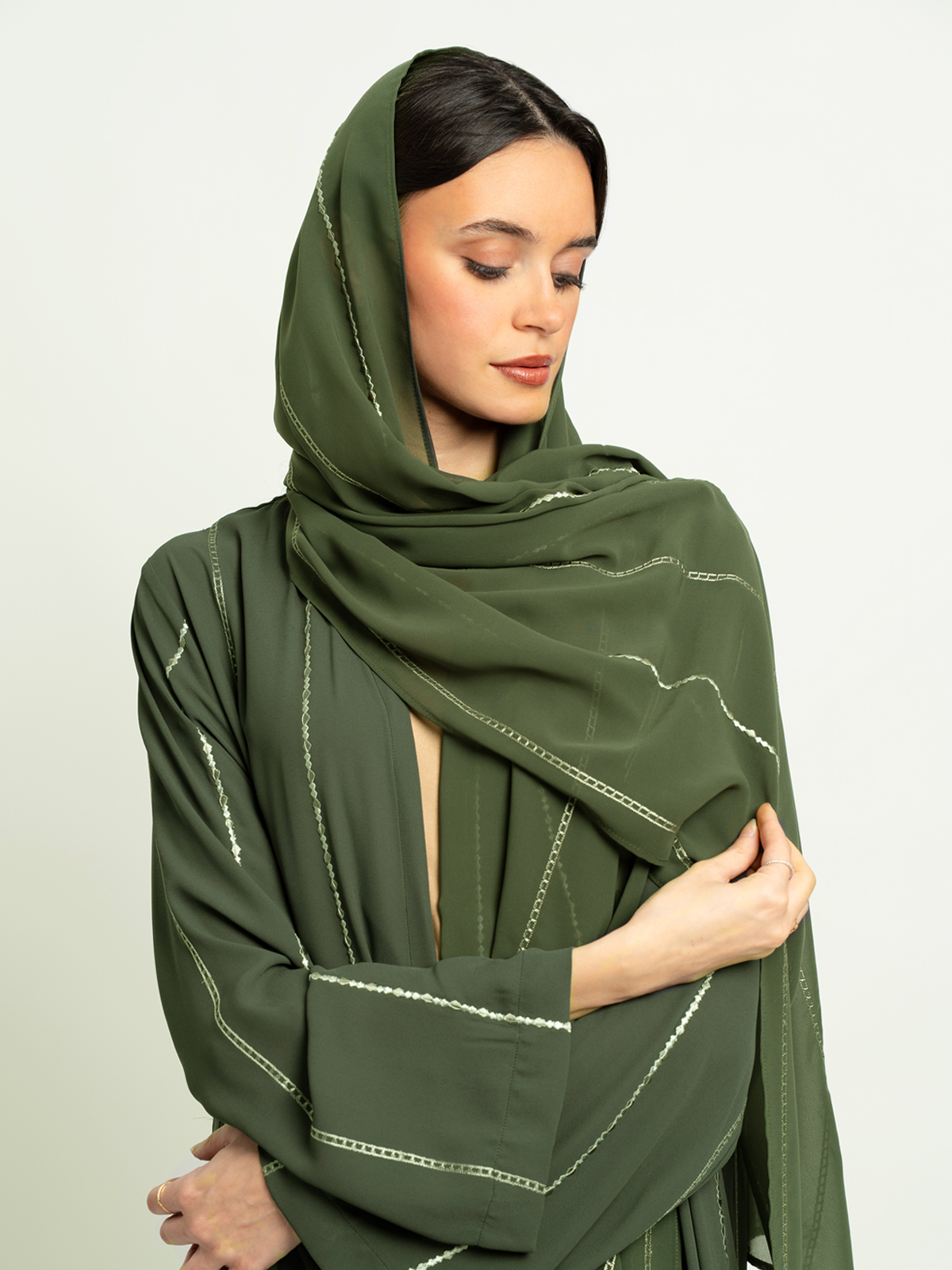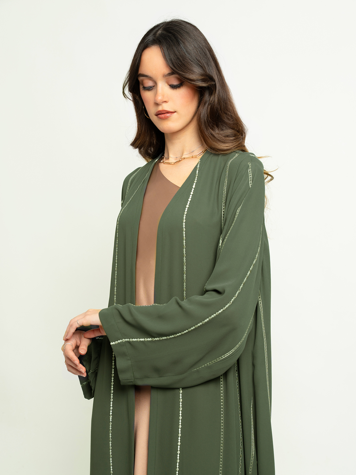 Abaya Color: Olive Green Abaya with Chained Lines Embroidery.