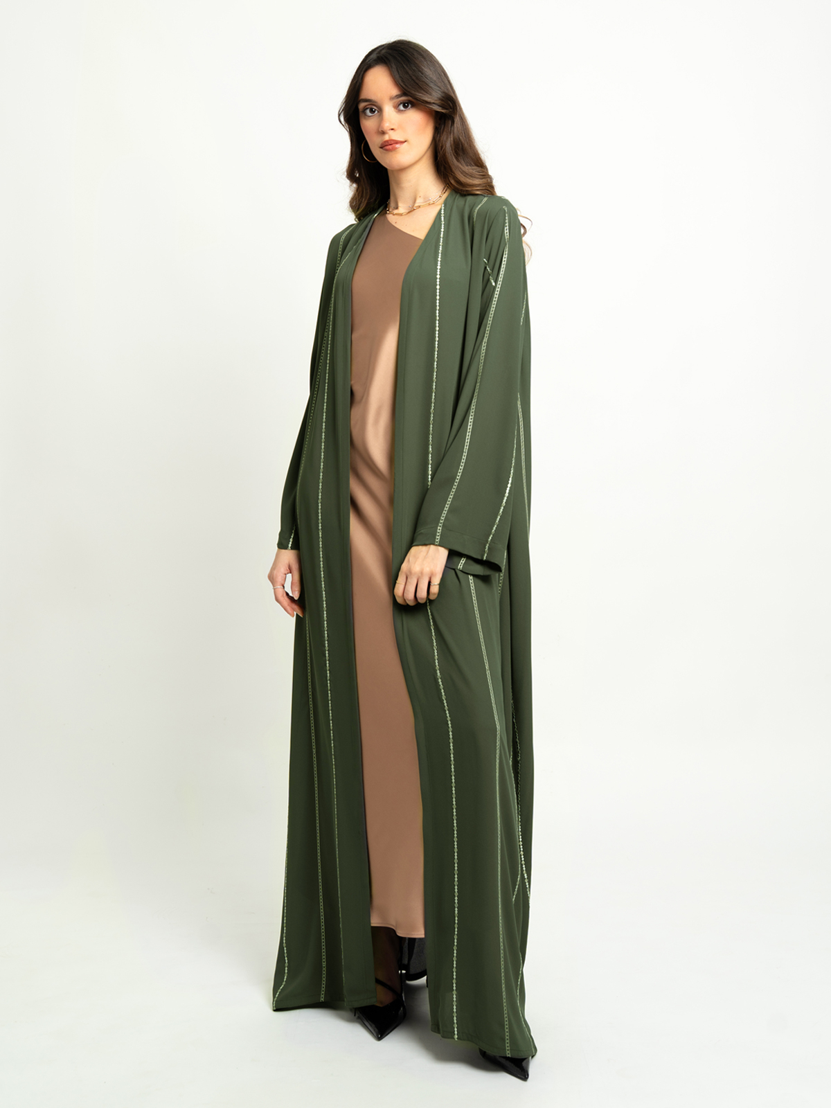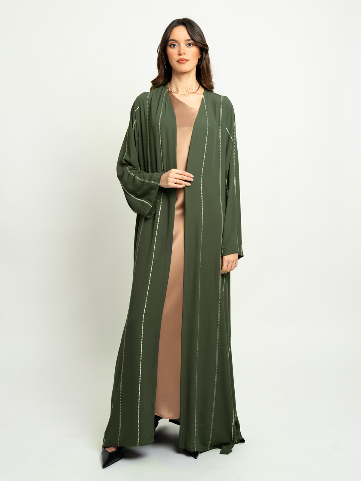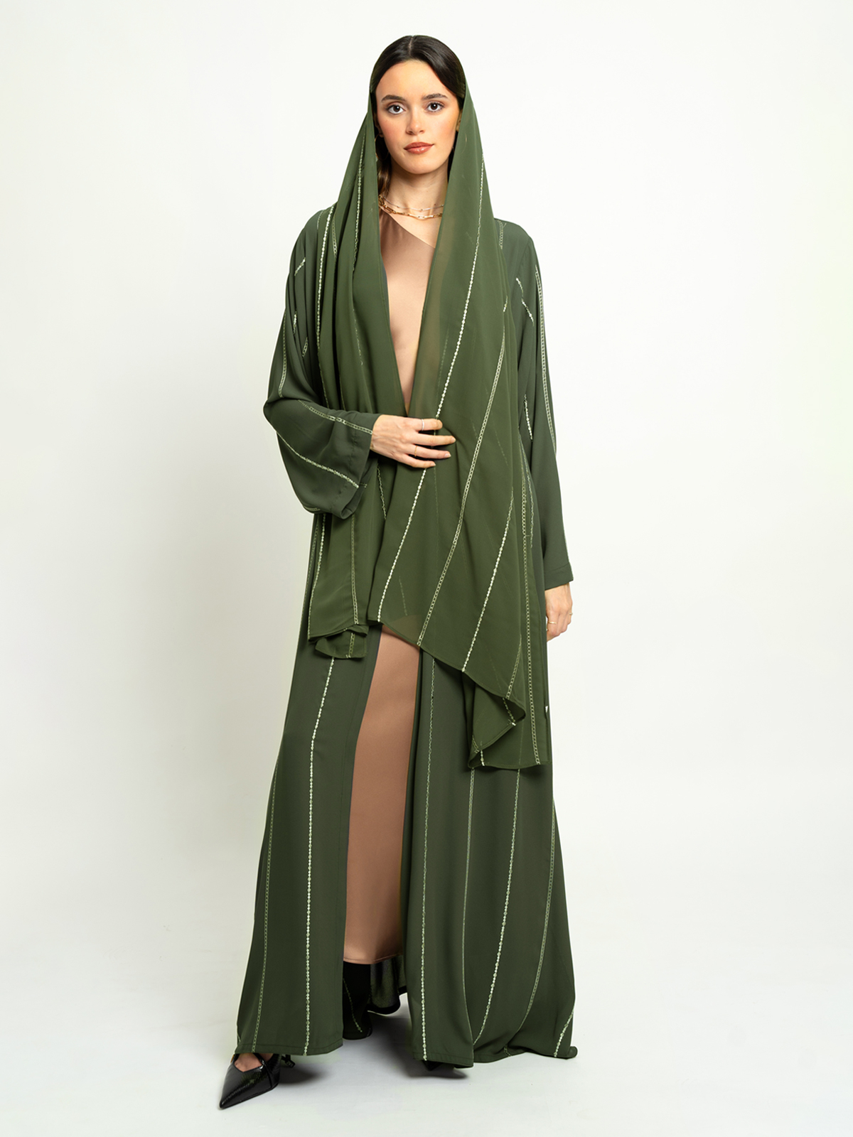 Abaya Color: Olive Green Abaya with Chained Lines Embroidery.