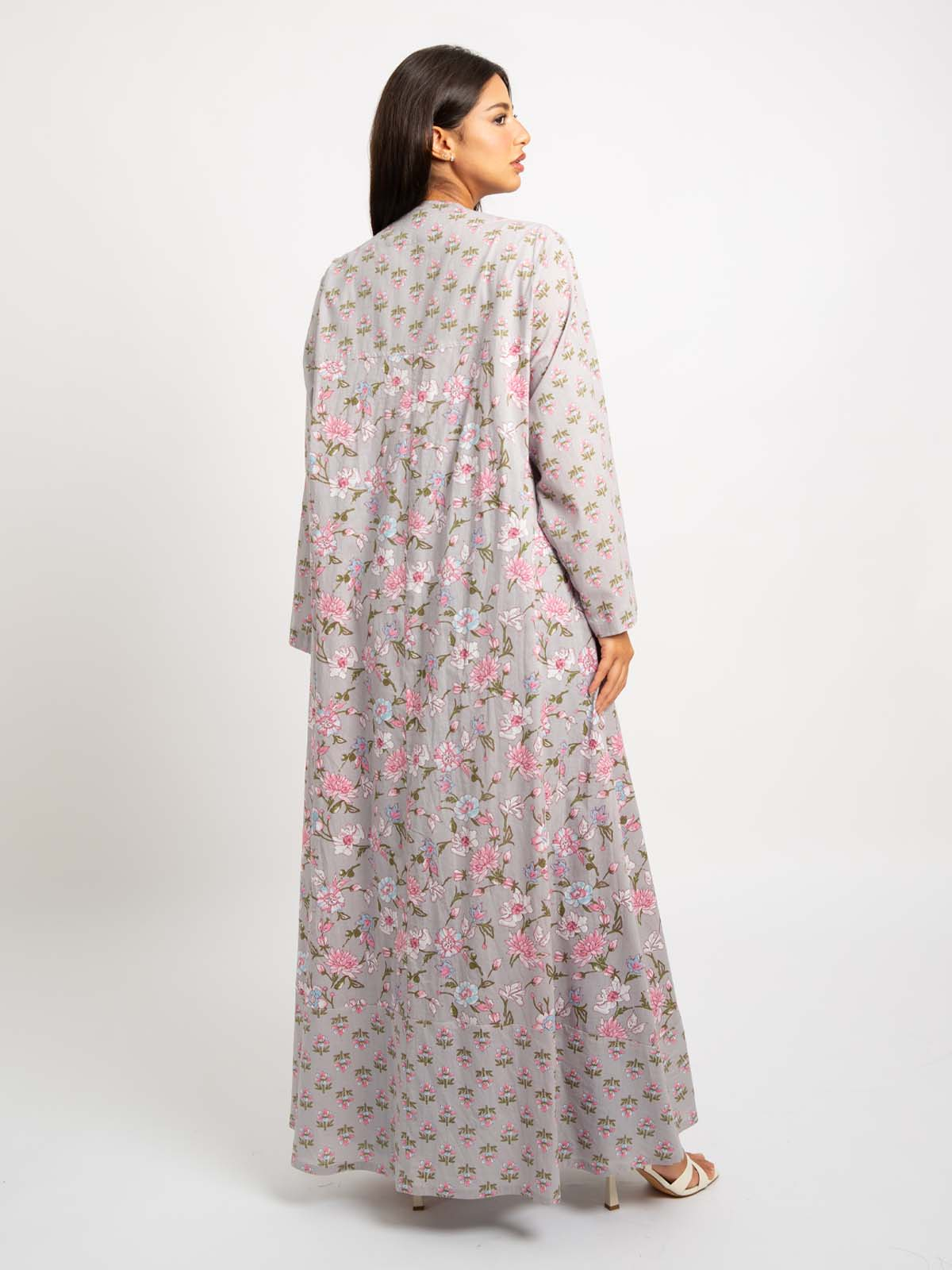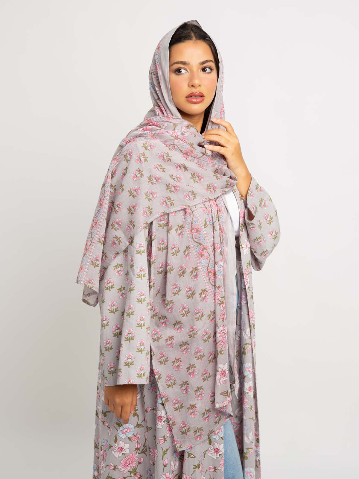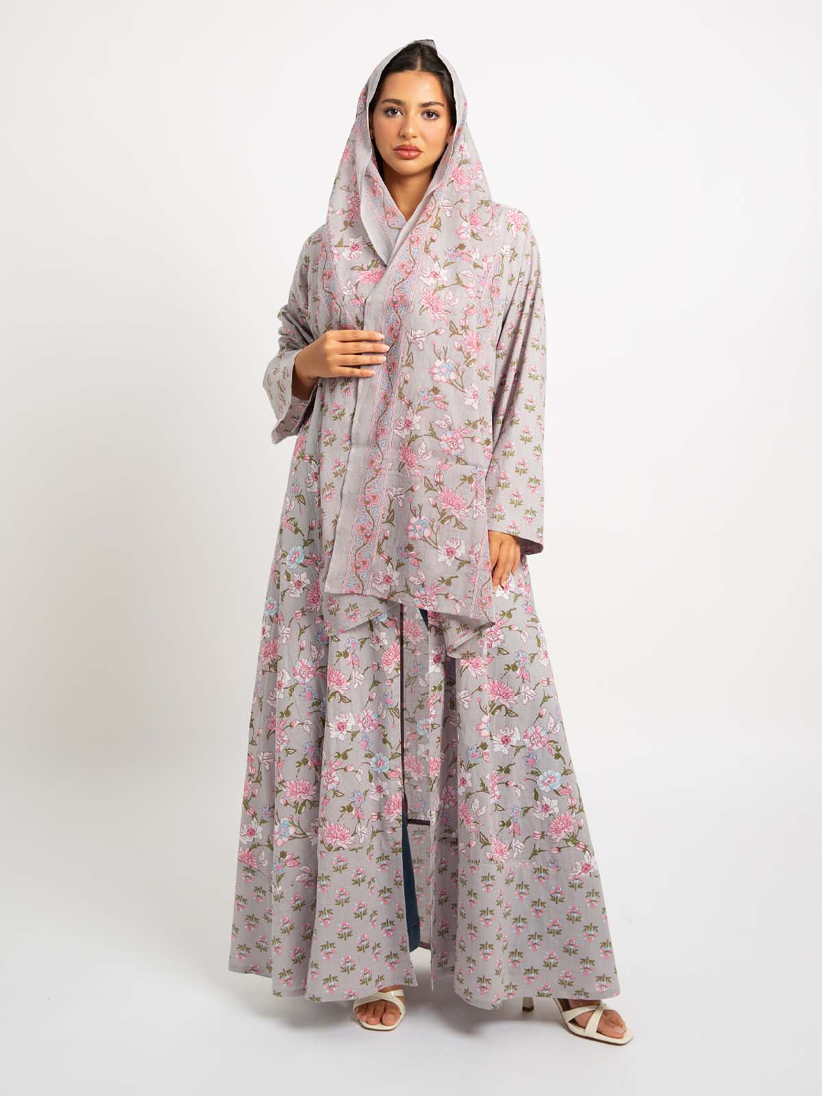 Half Cloche A-Cut Long Open Abaya in Printed Cotton Fabric