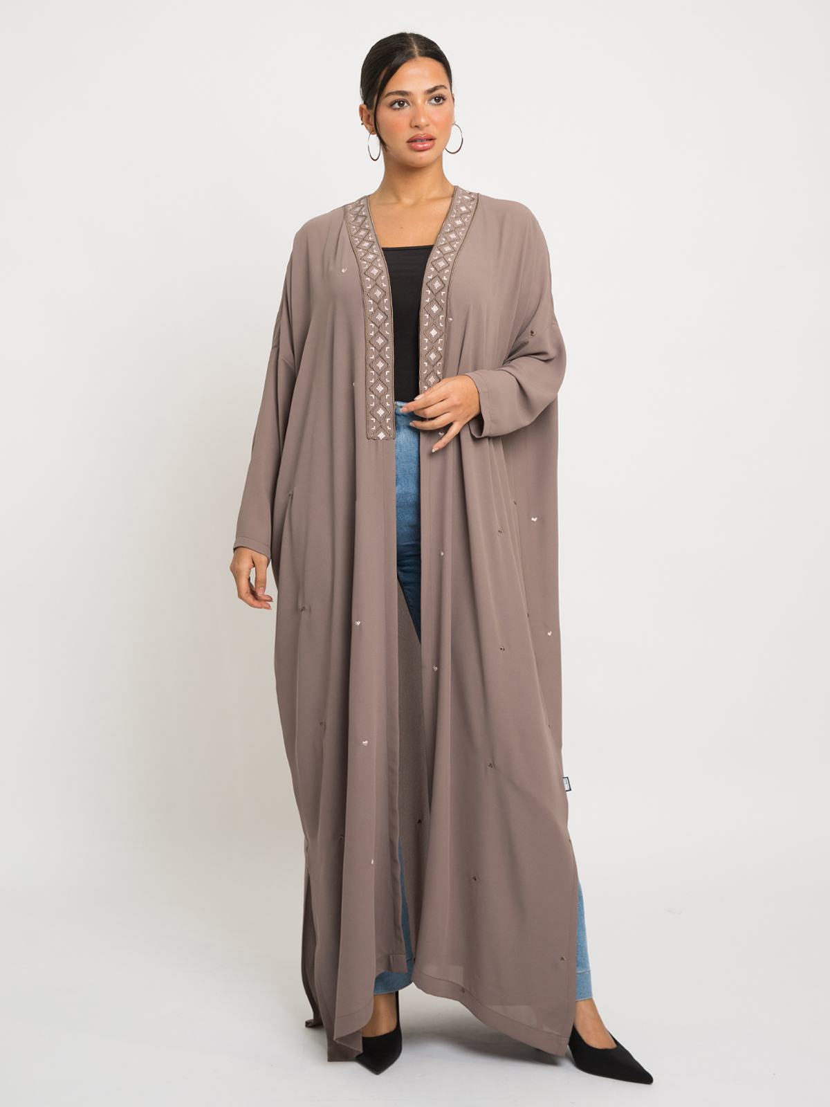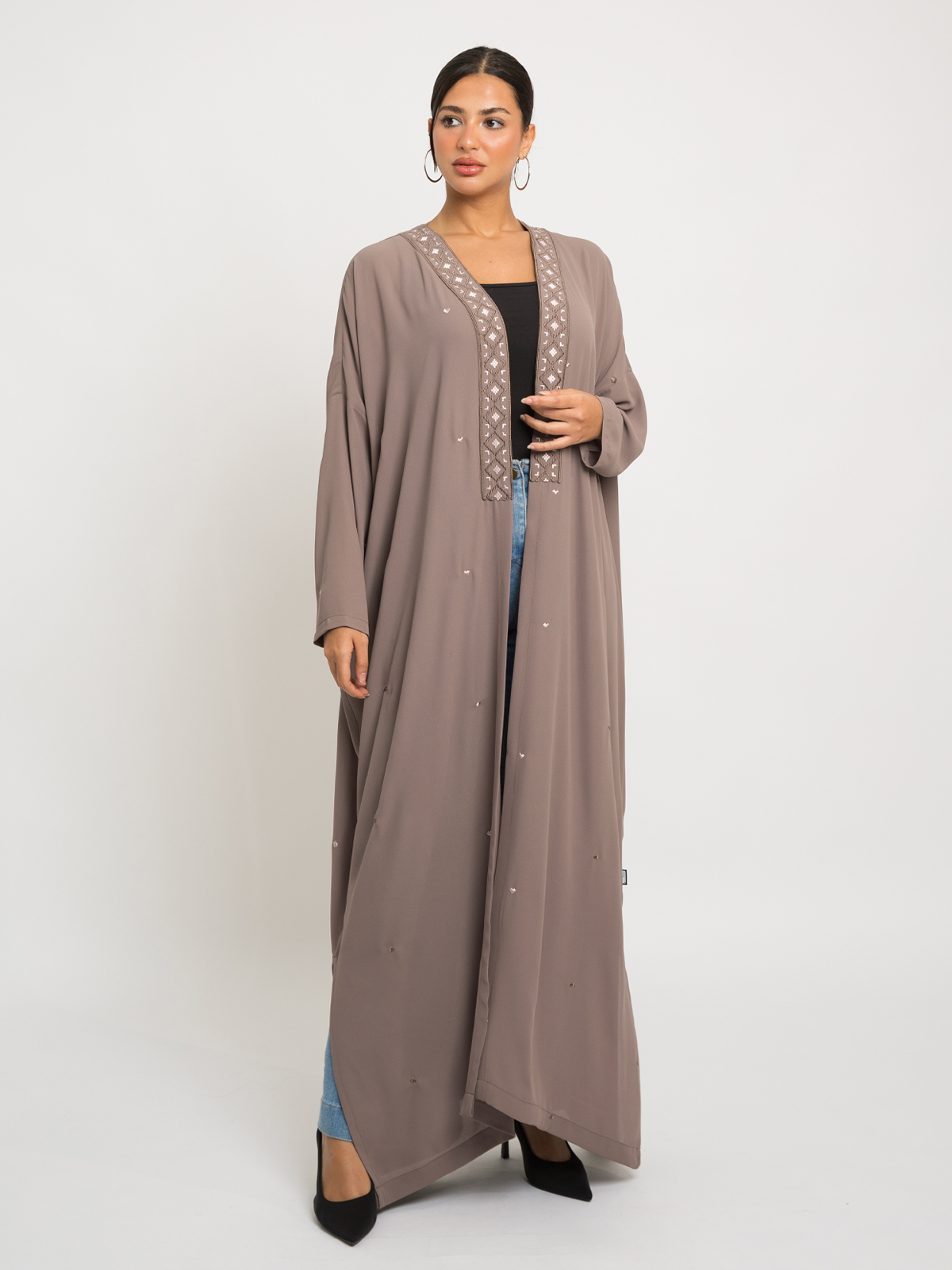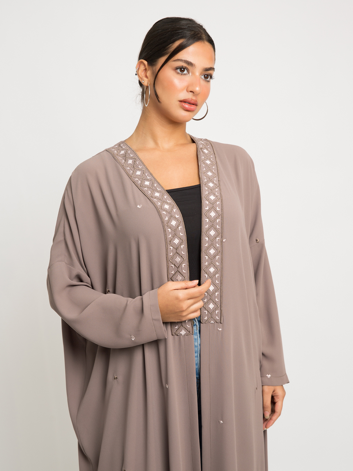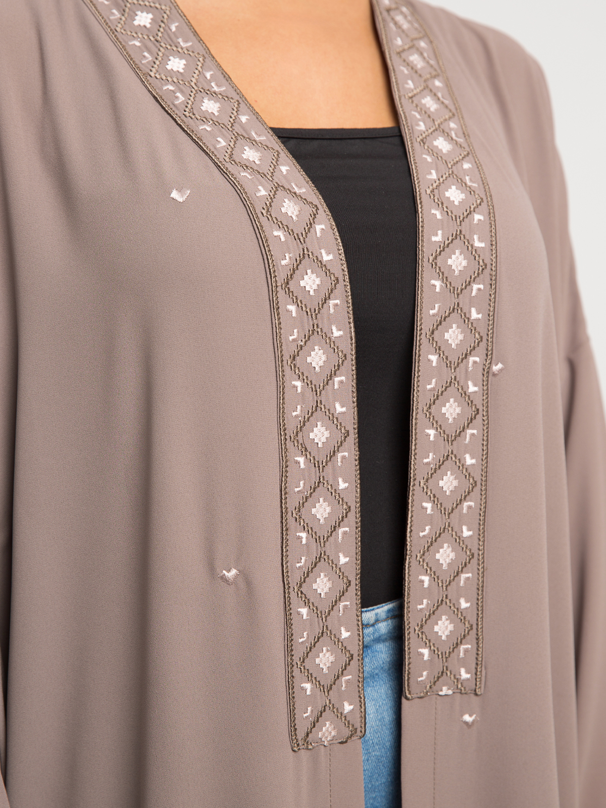 Wide-fit Tight Sleeves Long Open Abaya in Embroidered Light Crepe Fabric