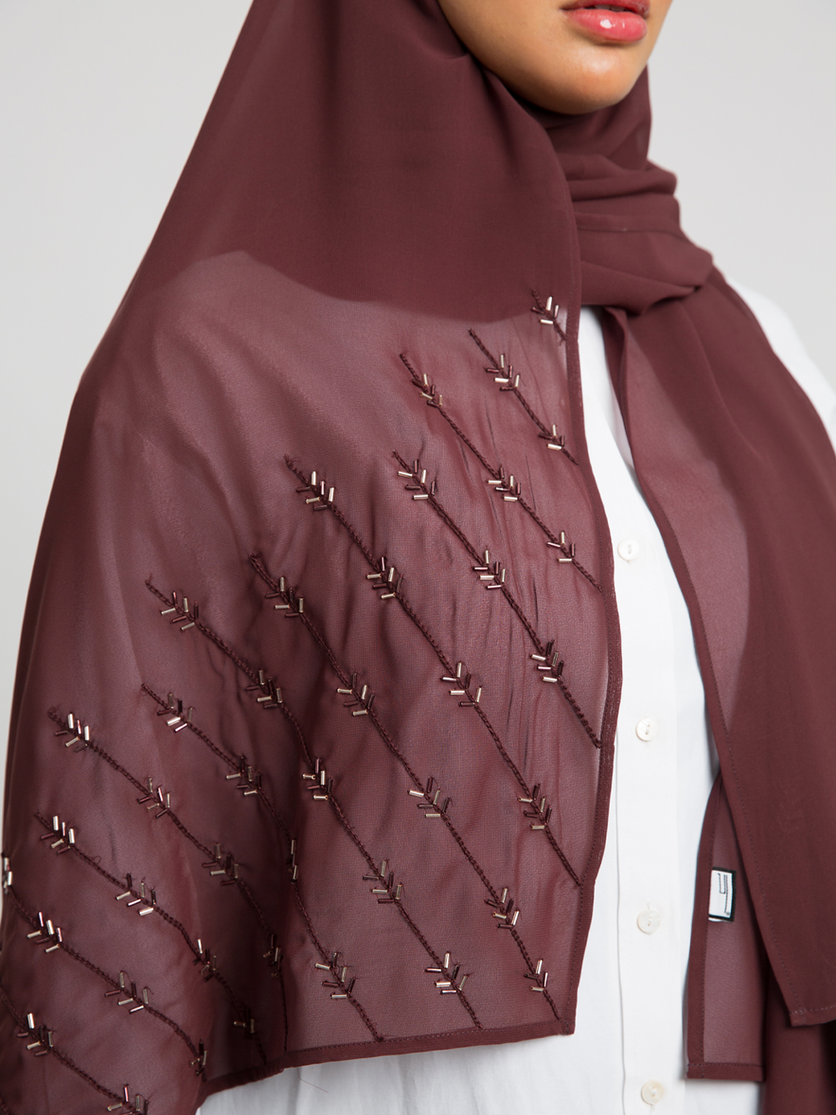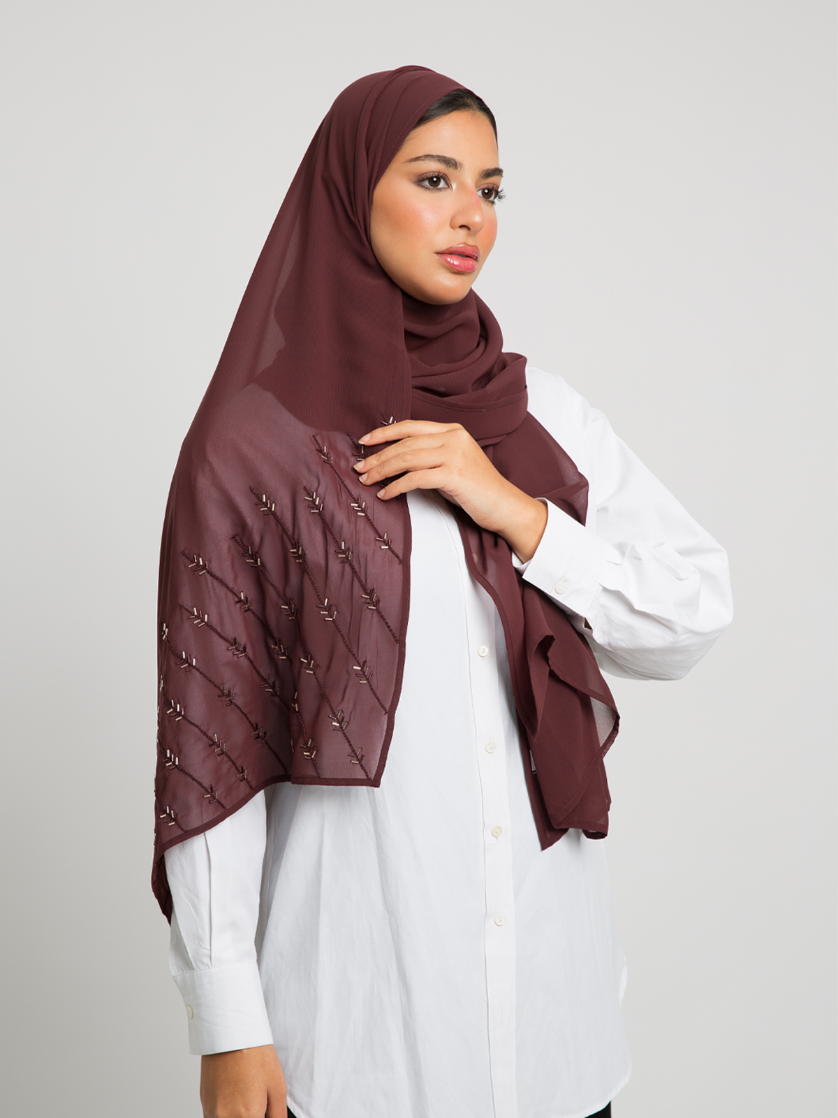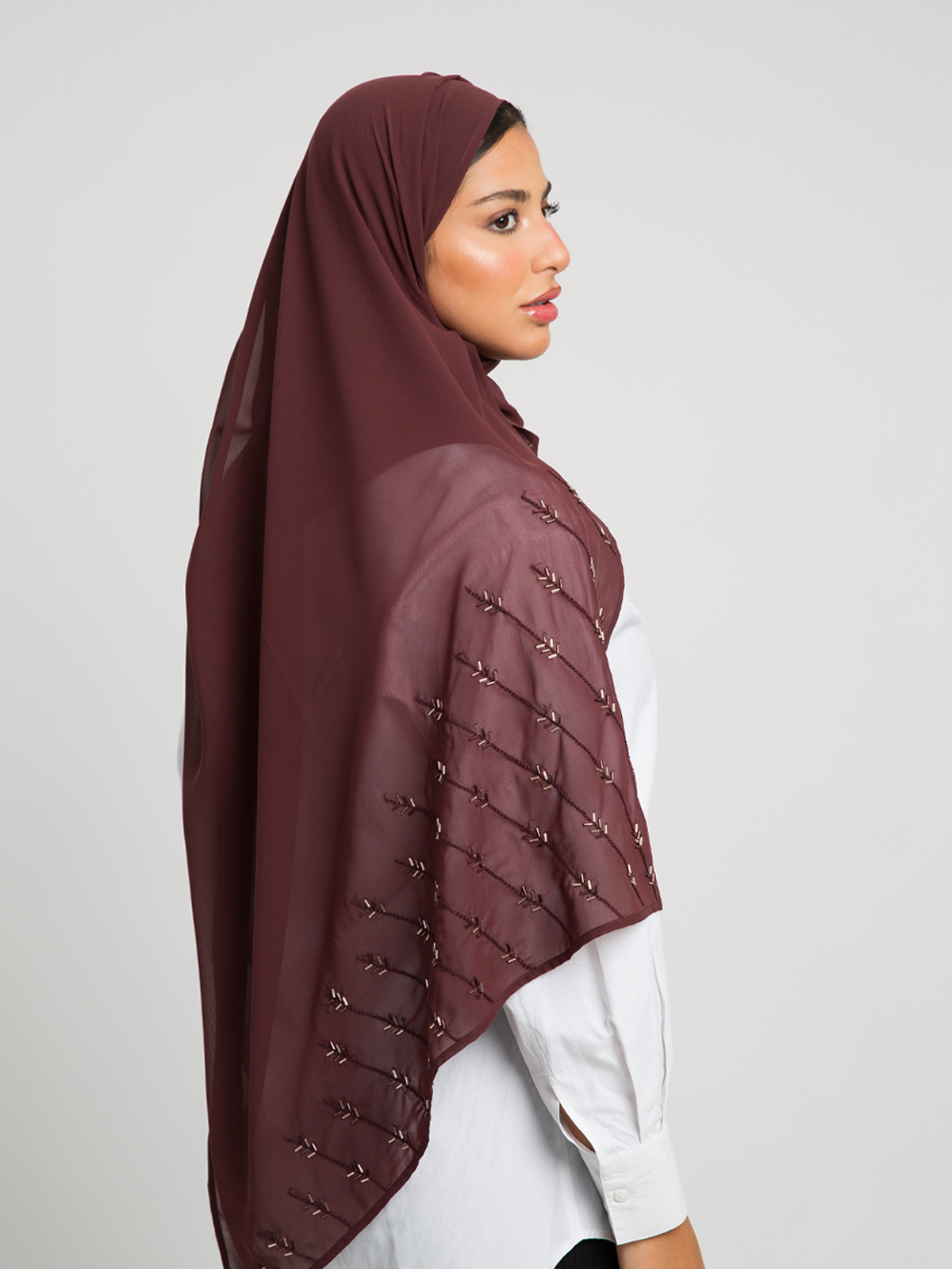 Hijab color: Maroon Tarha with Heritage-inspired Embroidery.