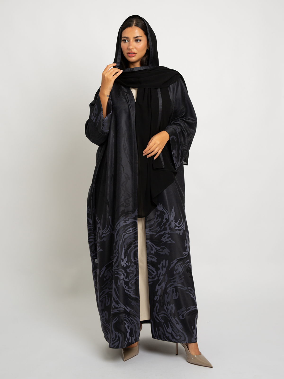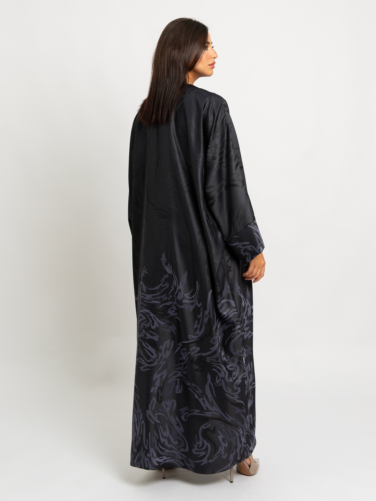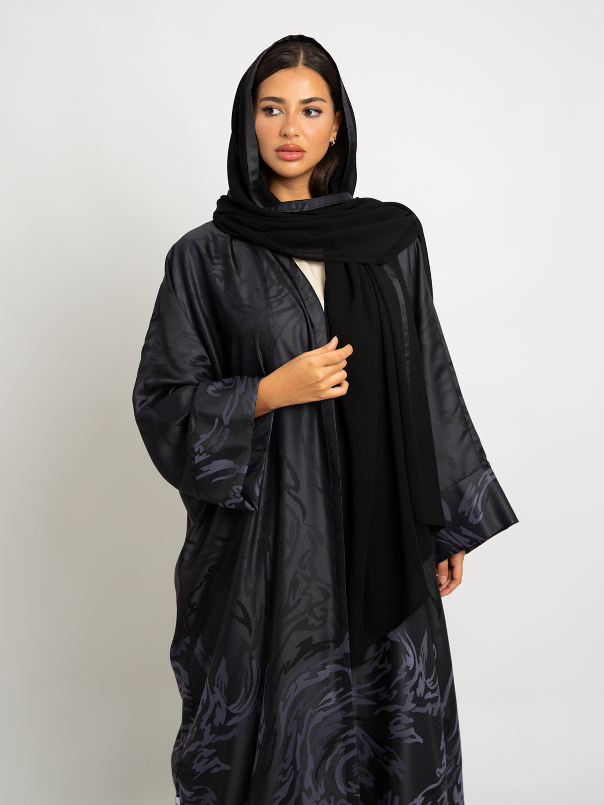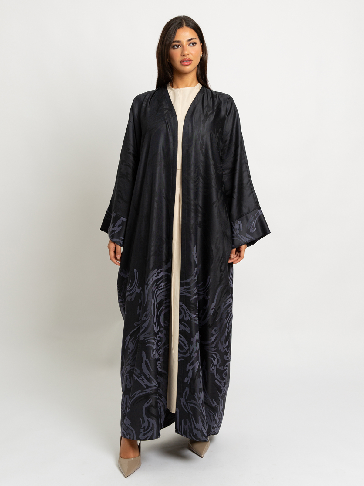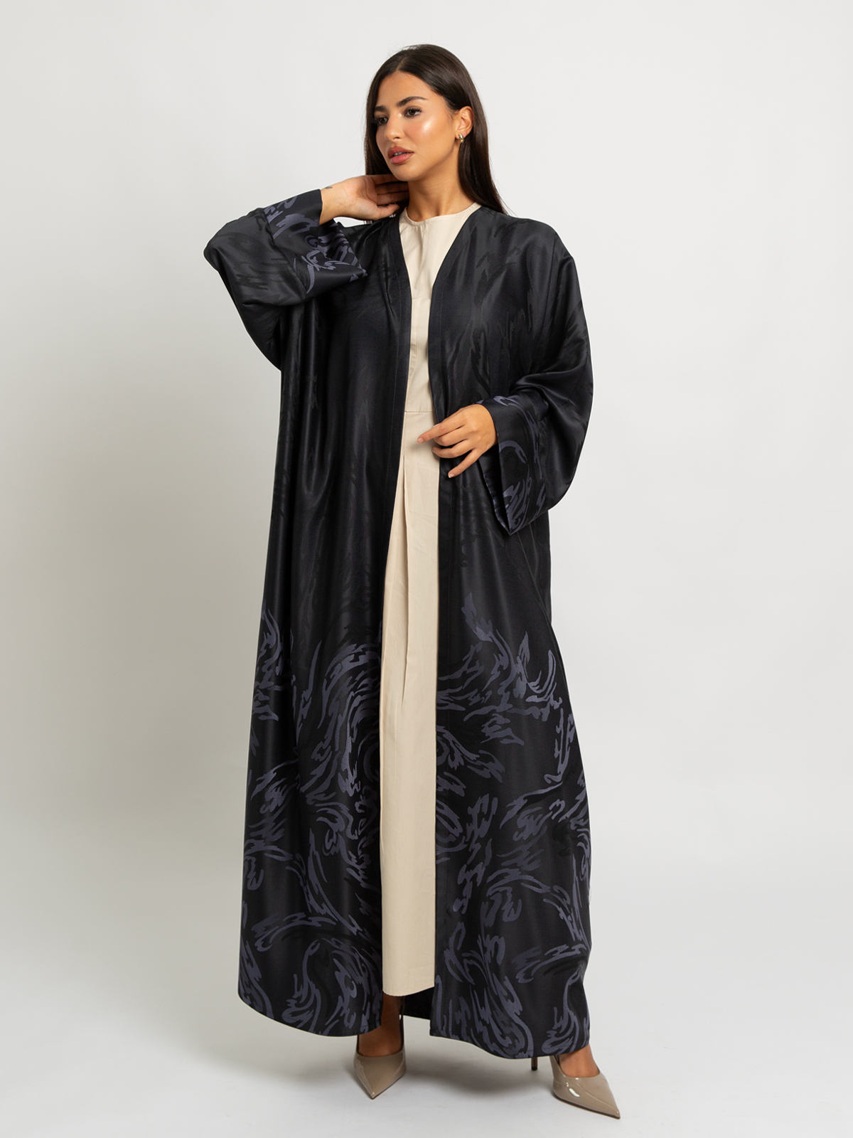 Wide-Fit Long Open Abaya in Mixed Woven Fabric