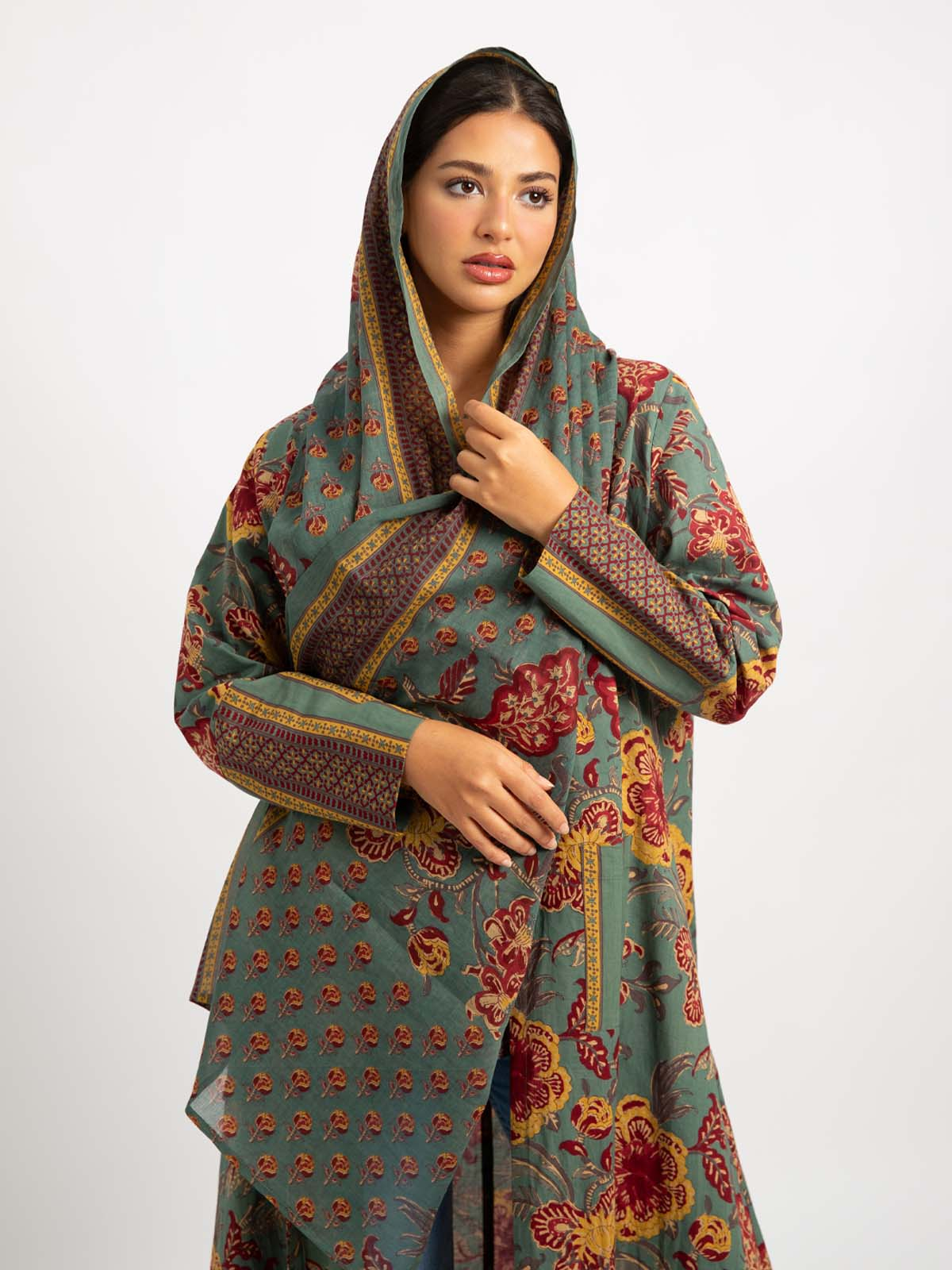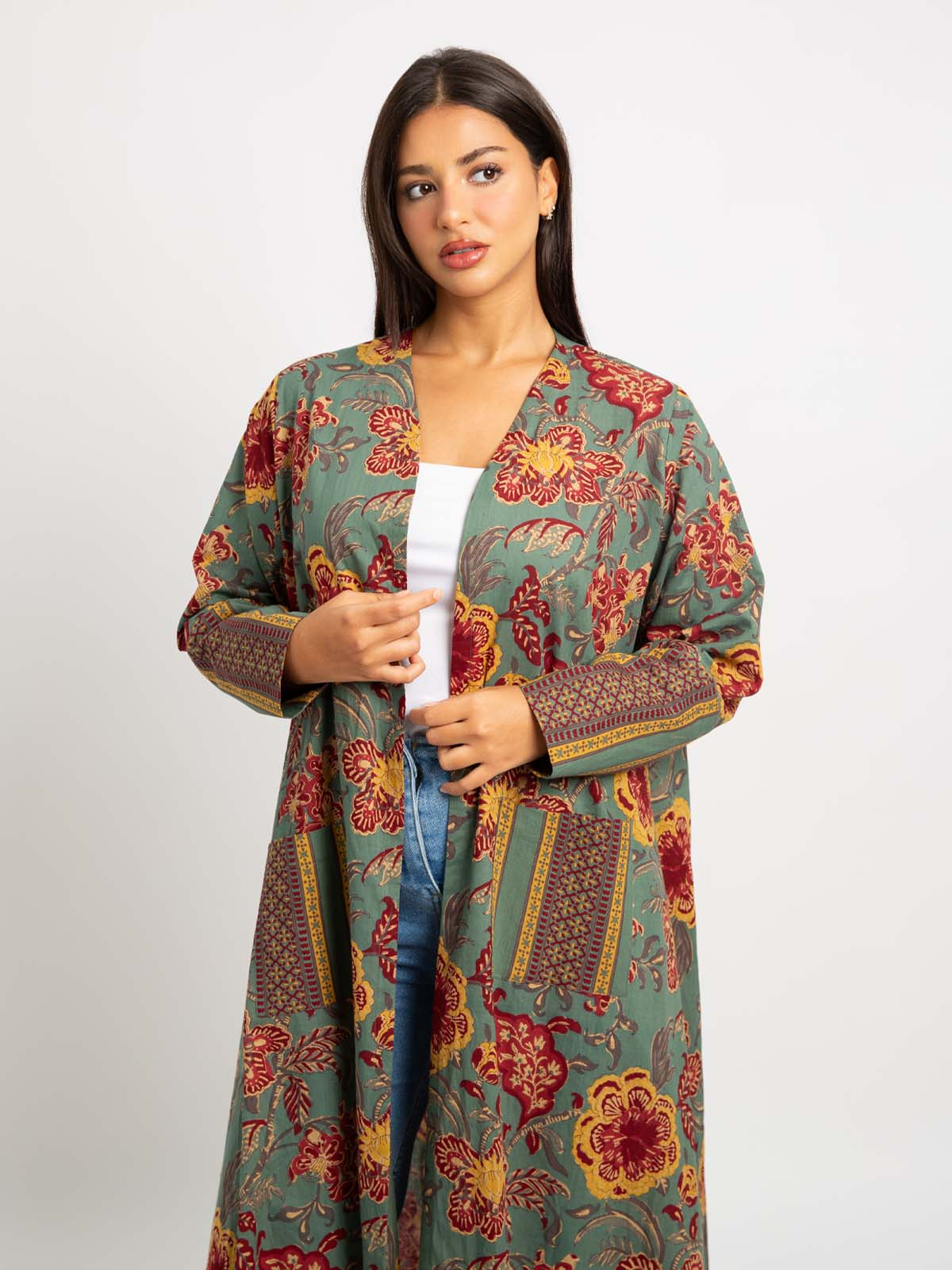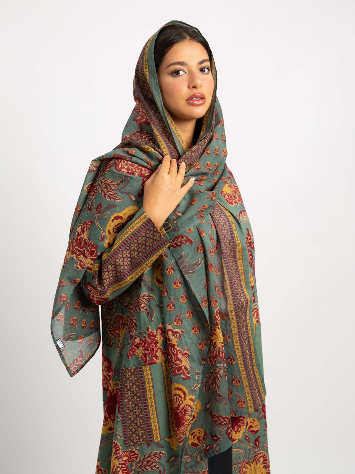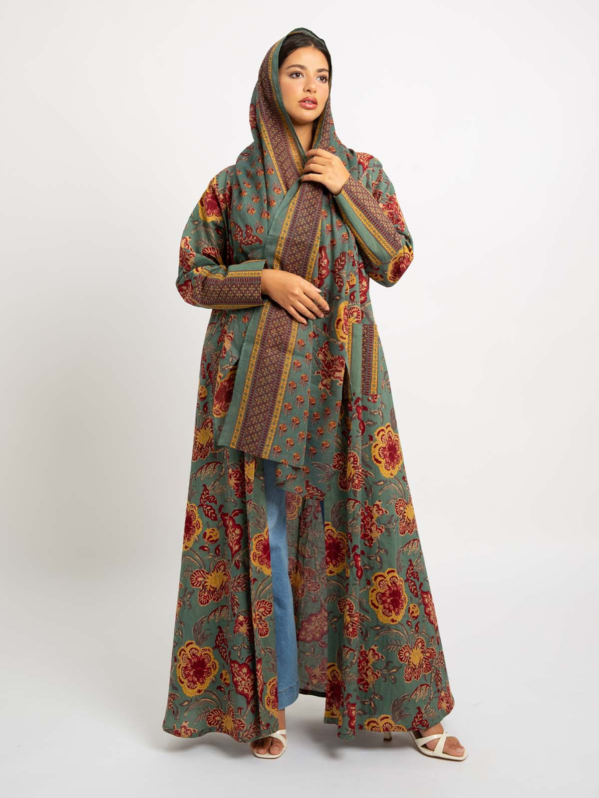 Half Cloche A-Cut Long Open Abaya in Printed Cotton Fabric