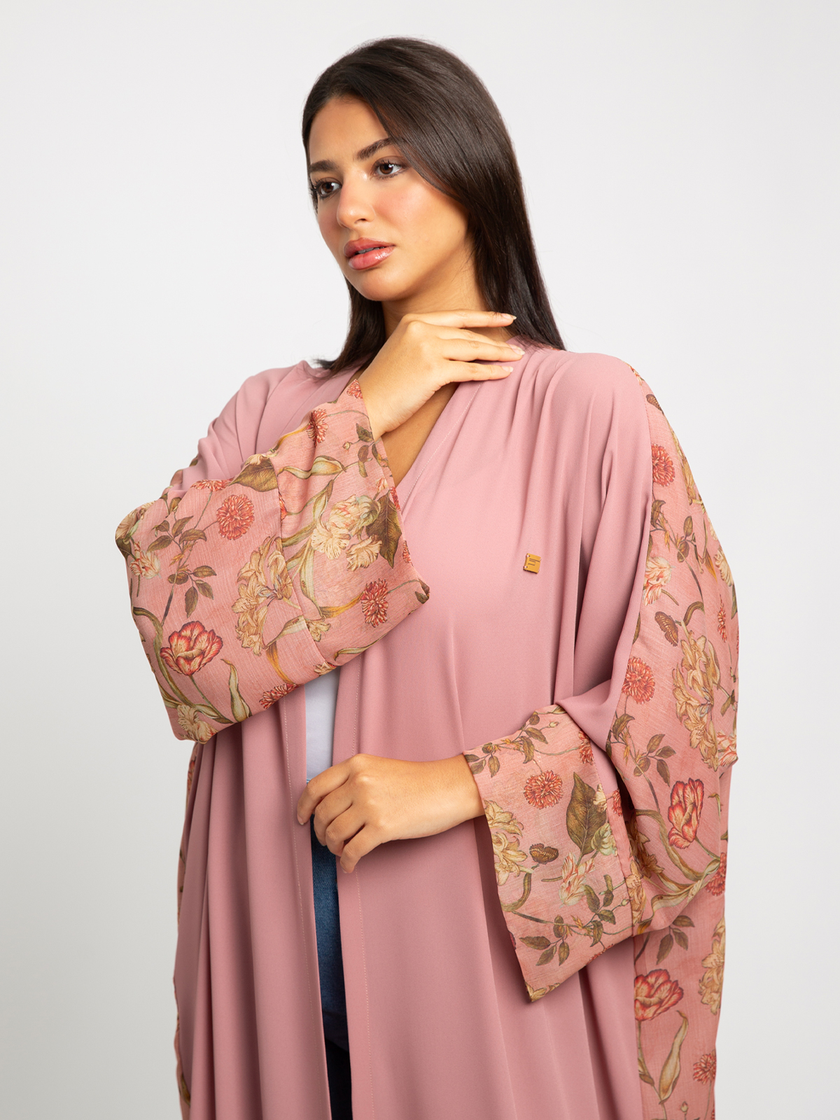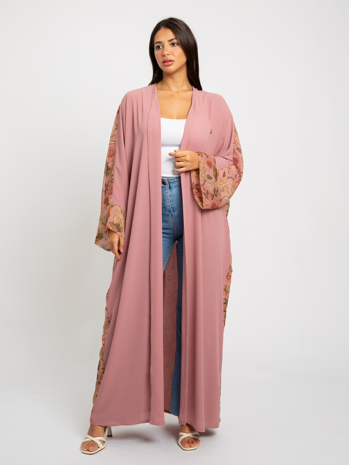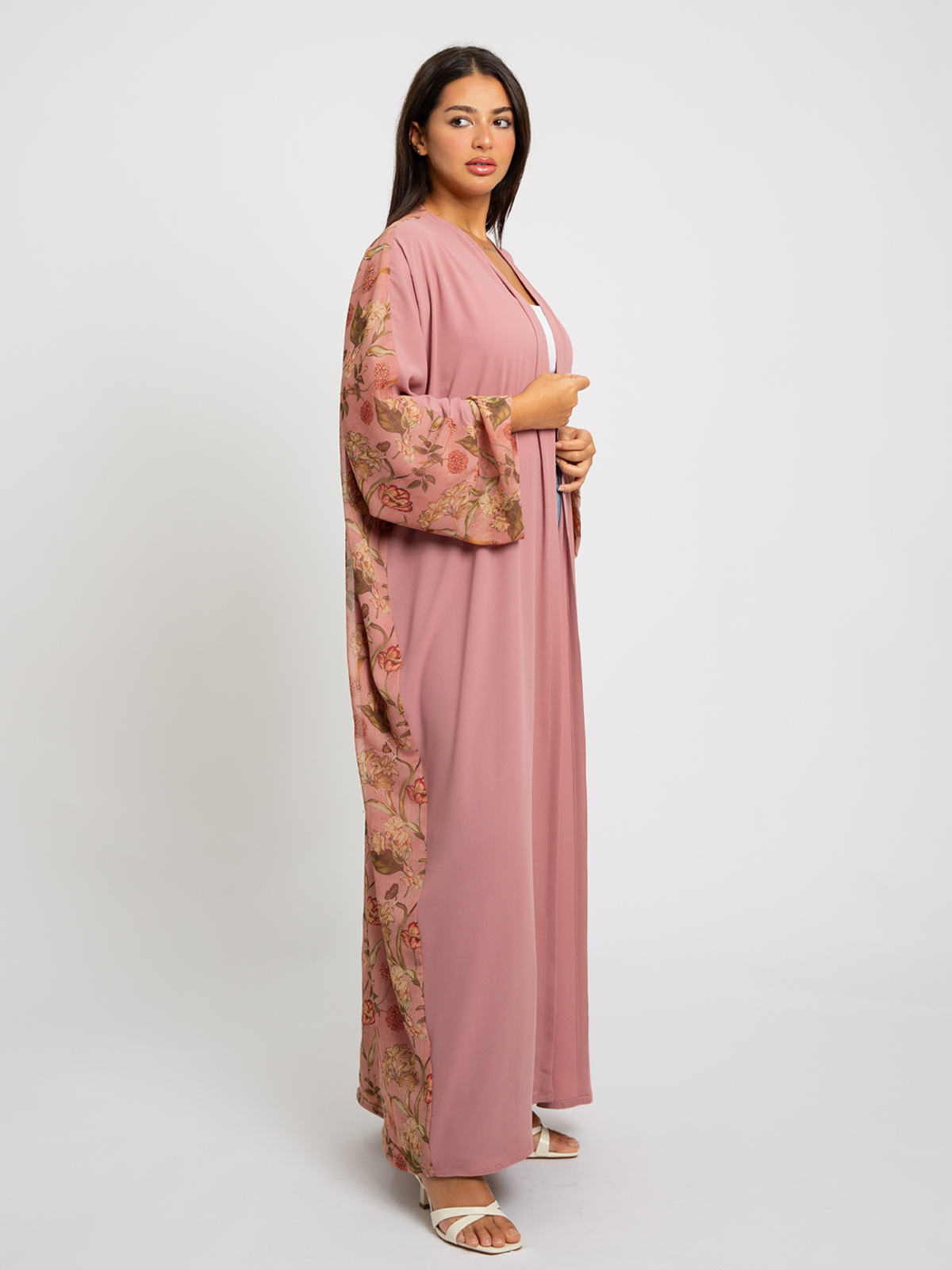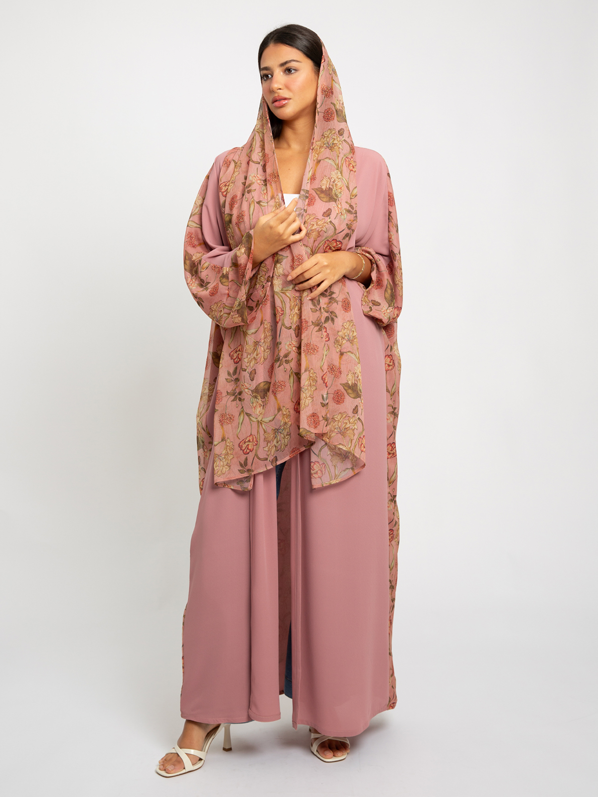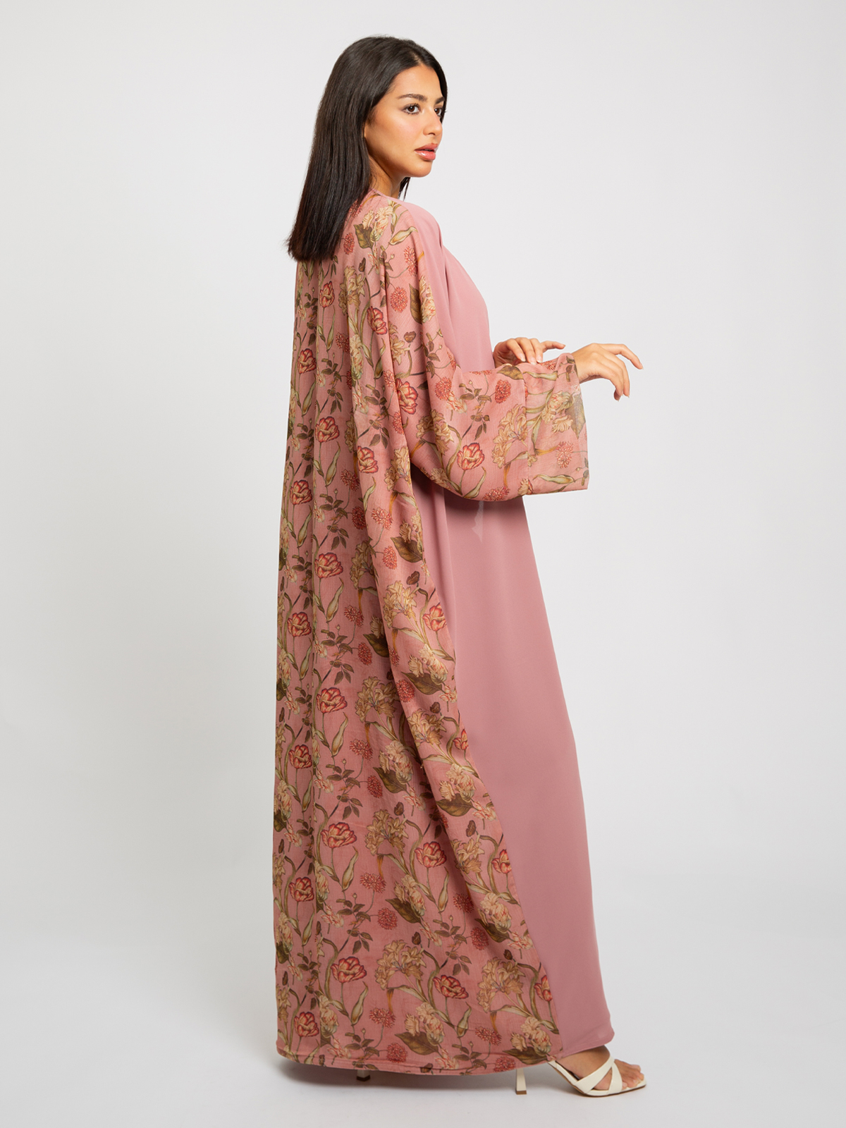 Wide-fit Long Open Abaya in Printed Chiffon Fabric