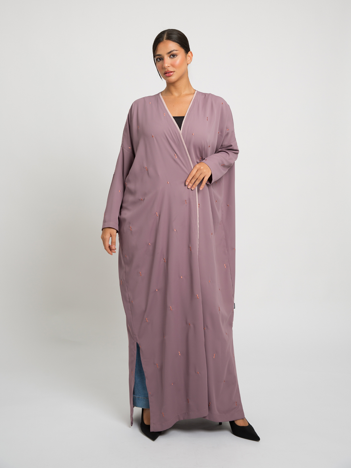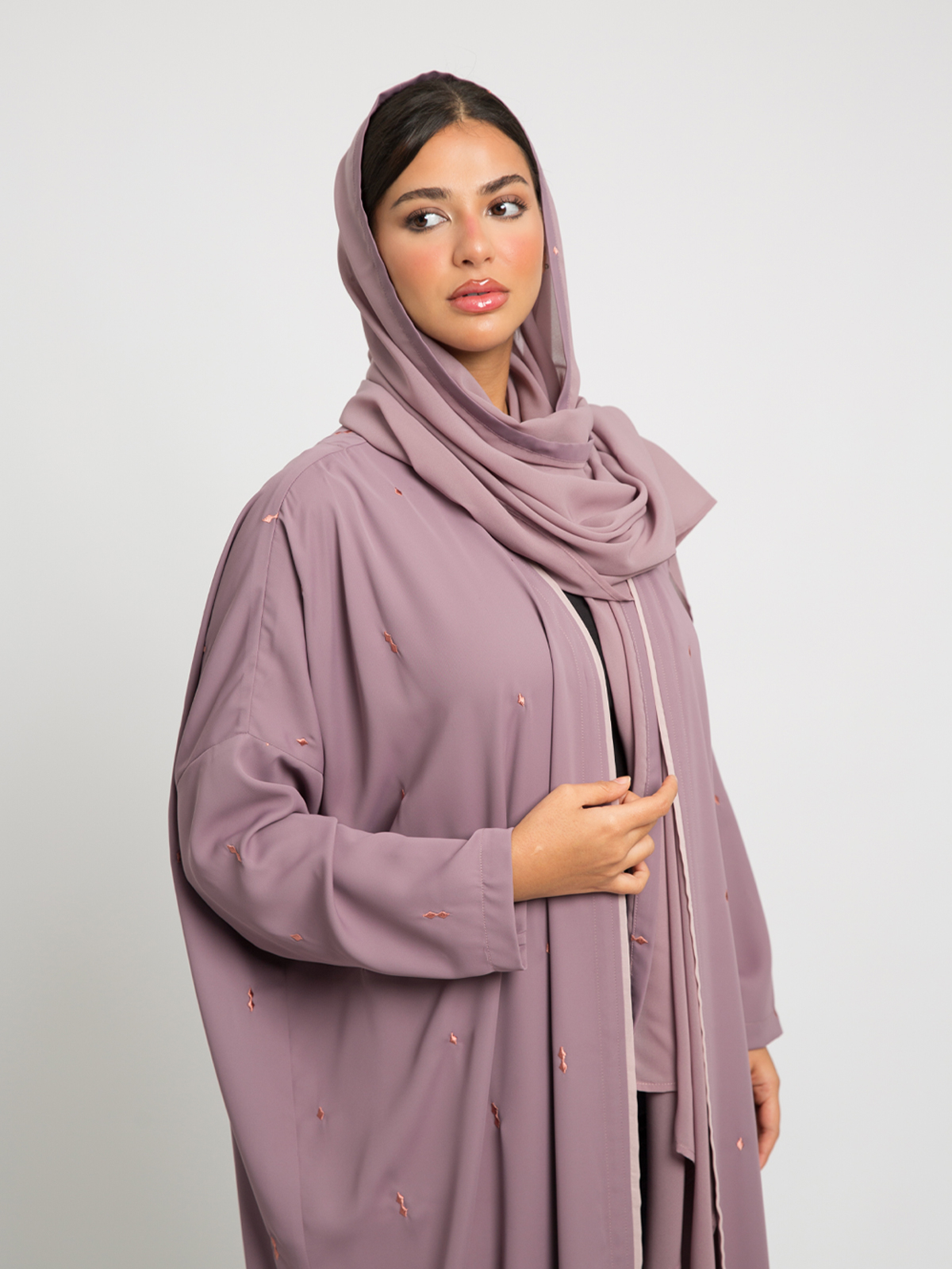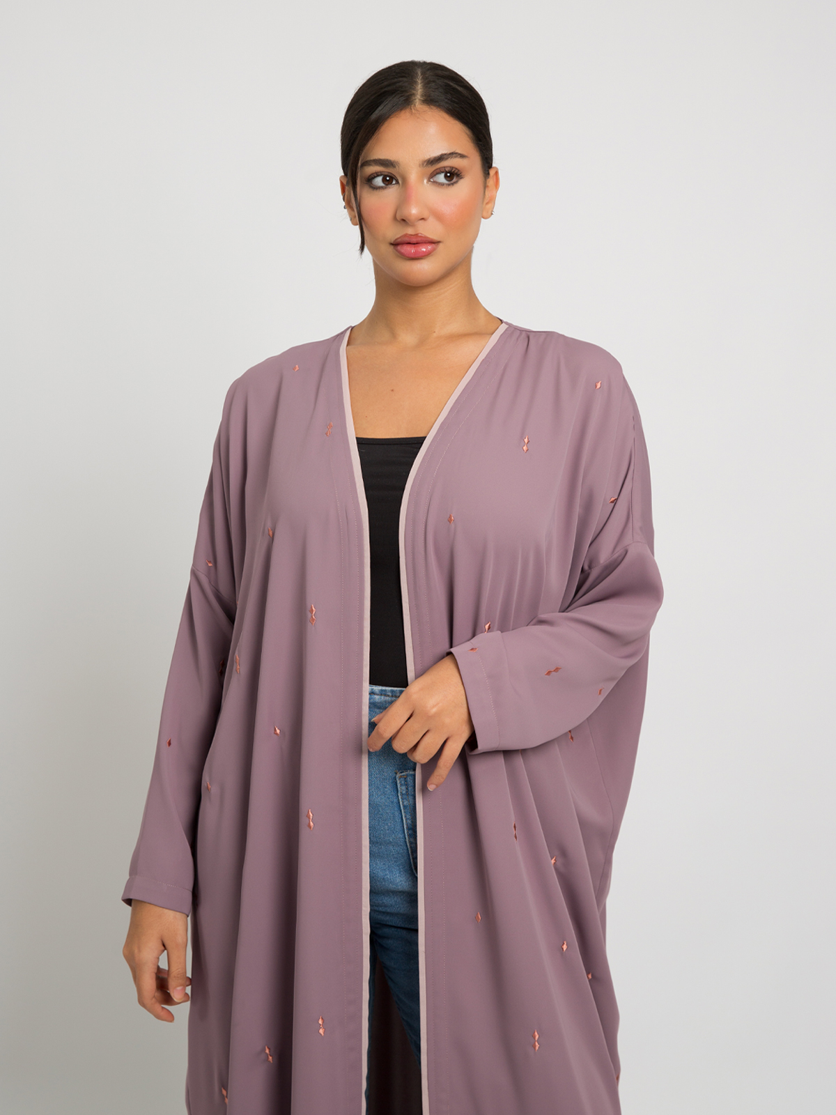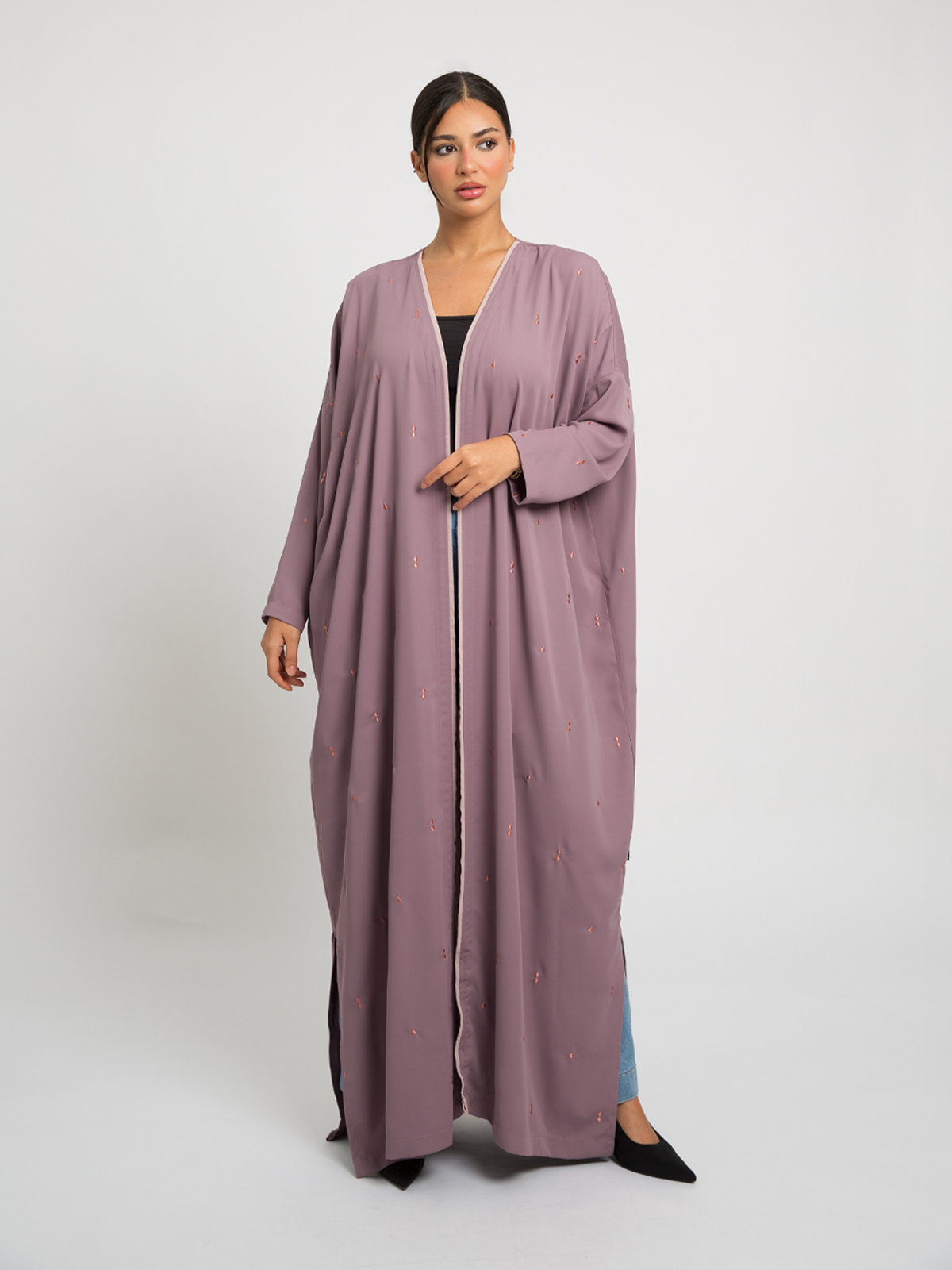 Wide-fit Tight Sleeves Long Open Abaya in Embroidered Crepe Fabric