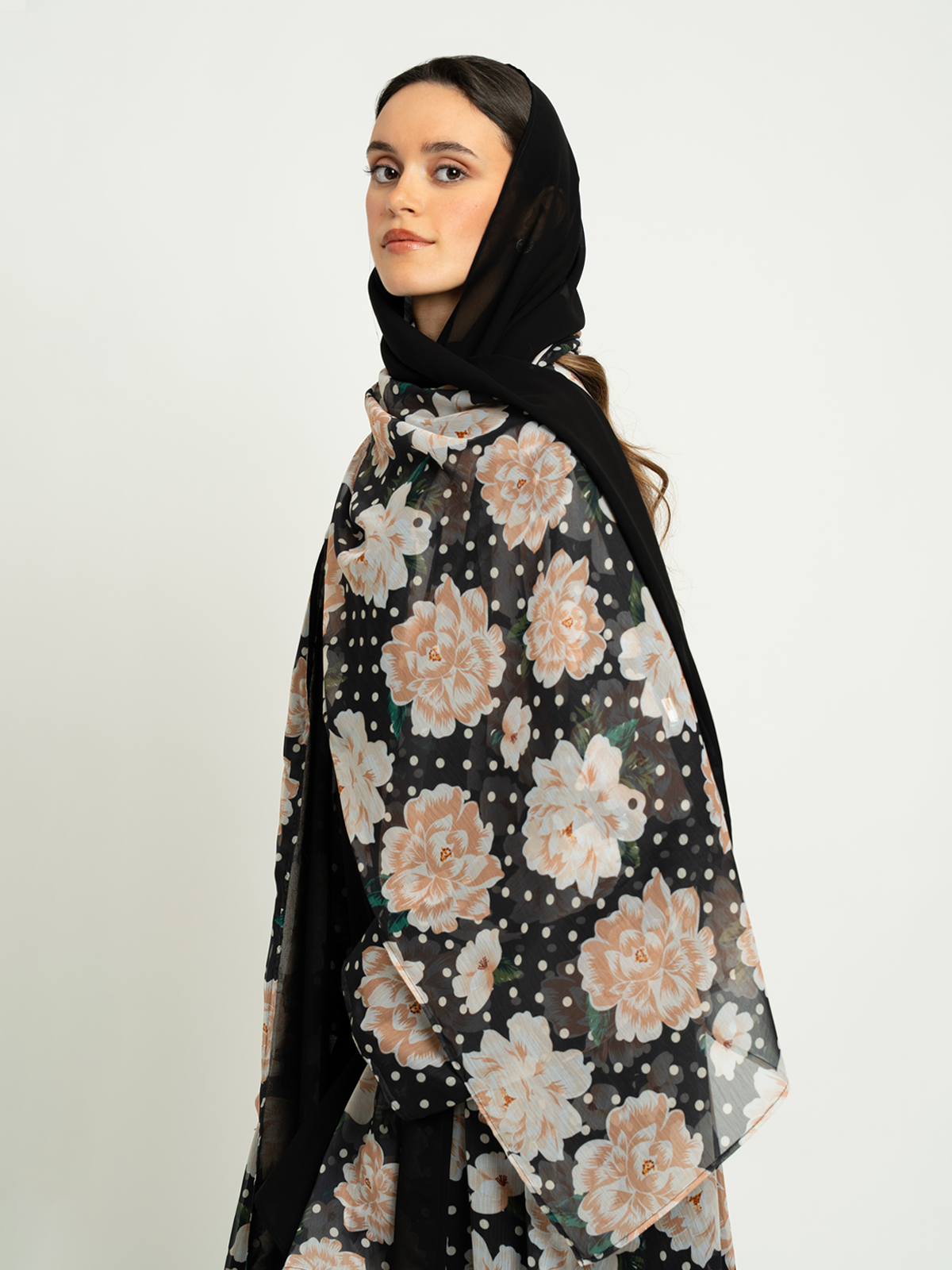 A new A-cut half cloche double-face abaya made from high-quality chiffon fabric, offering a soft, breathable feel you’ll appreciate all day long. The reversible design offers versatile styling options; a plain side for a soft daytime look, and a floral-printed side for elegant Ramadan evenings.