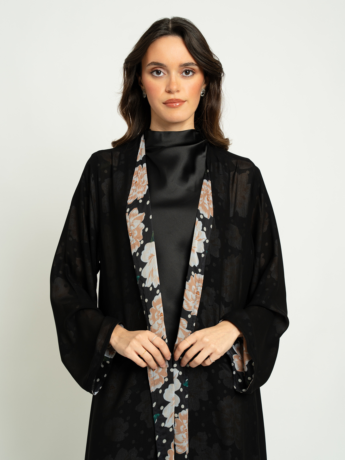 - Double face abaya has one plain side and one printed side.