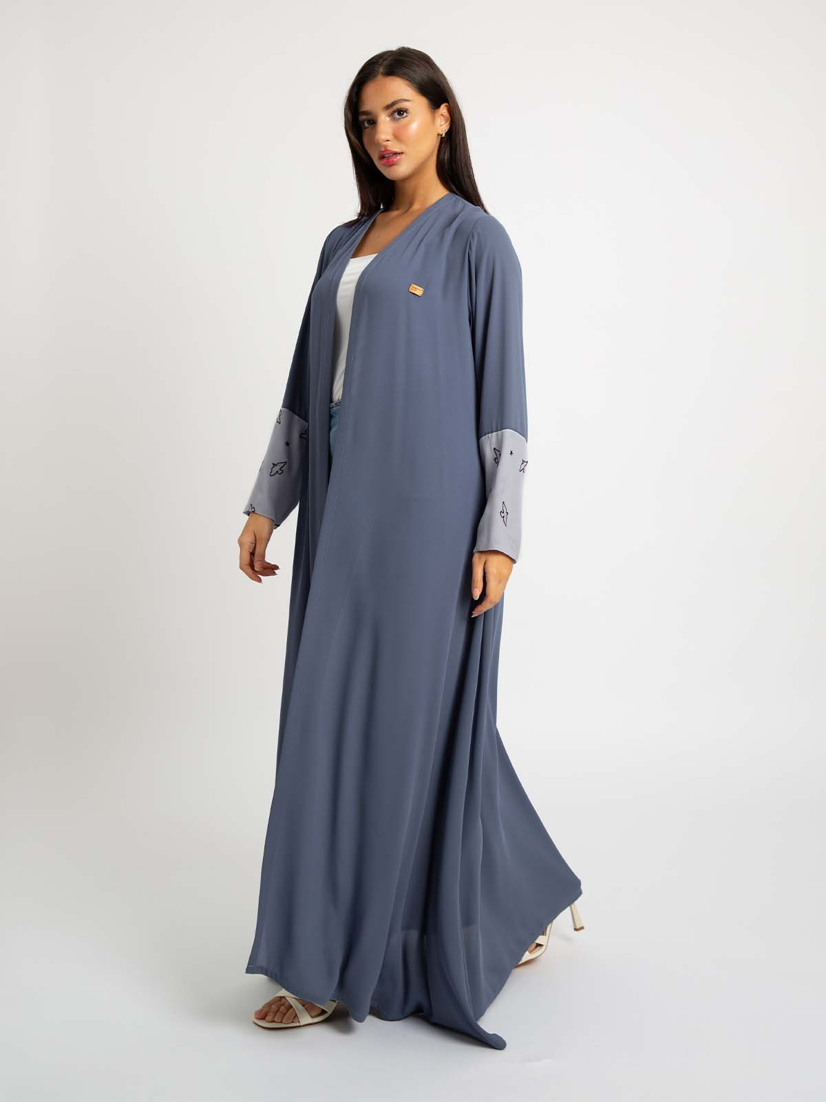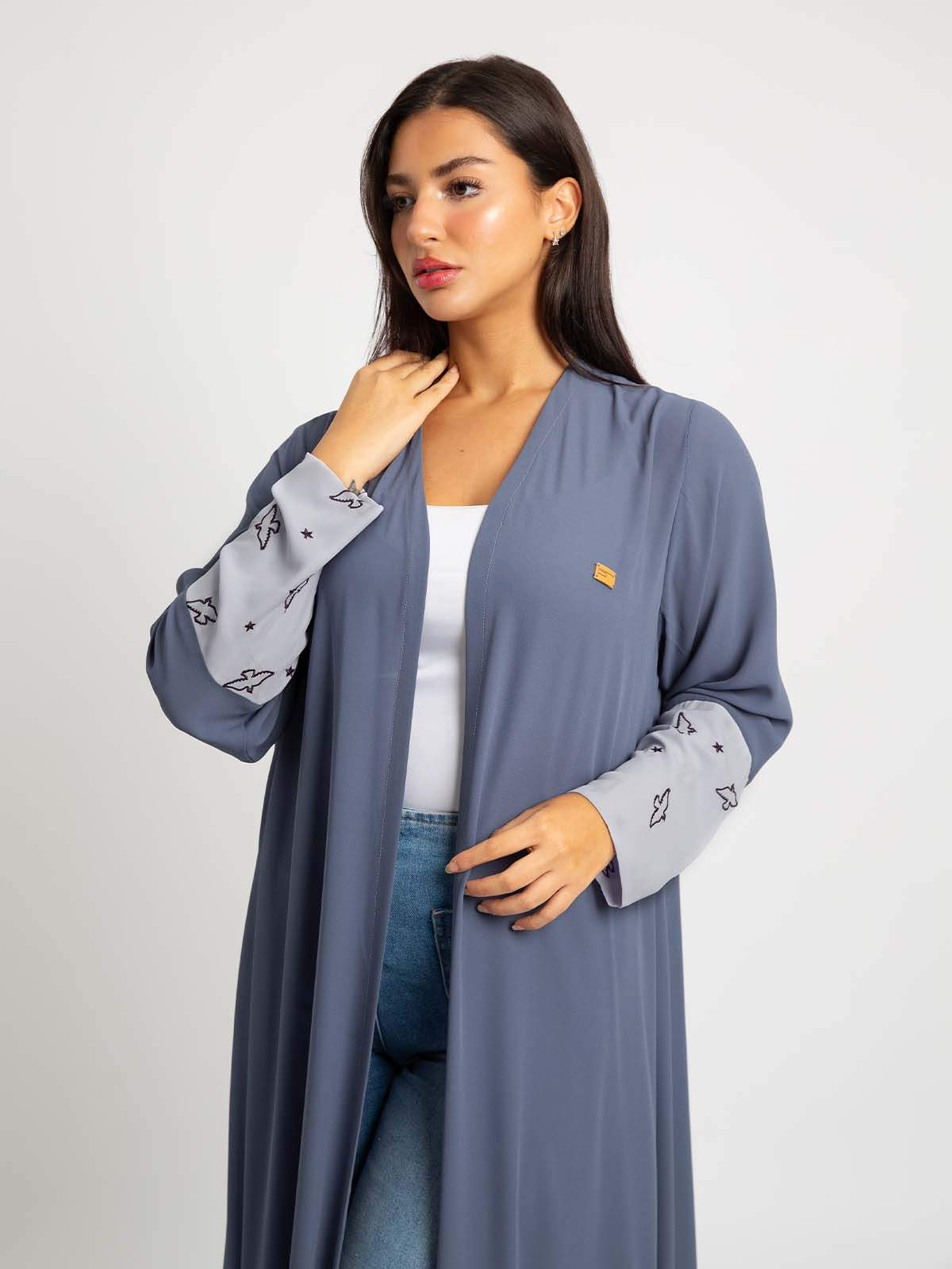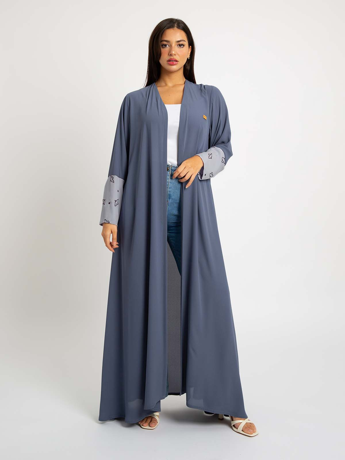 Long Open Abaya with Tight Sleeves in Embroidered Crepe Fabric