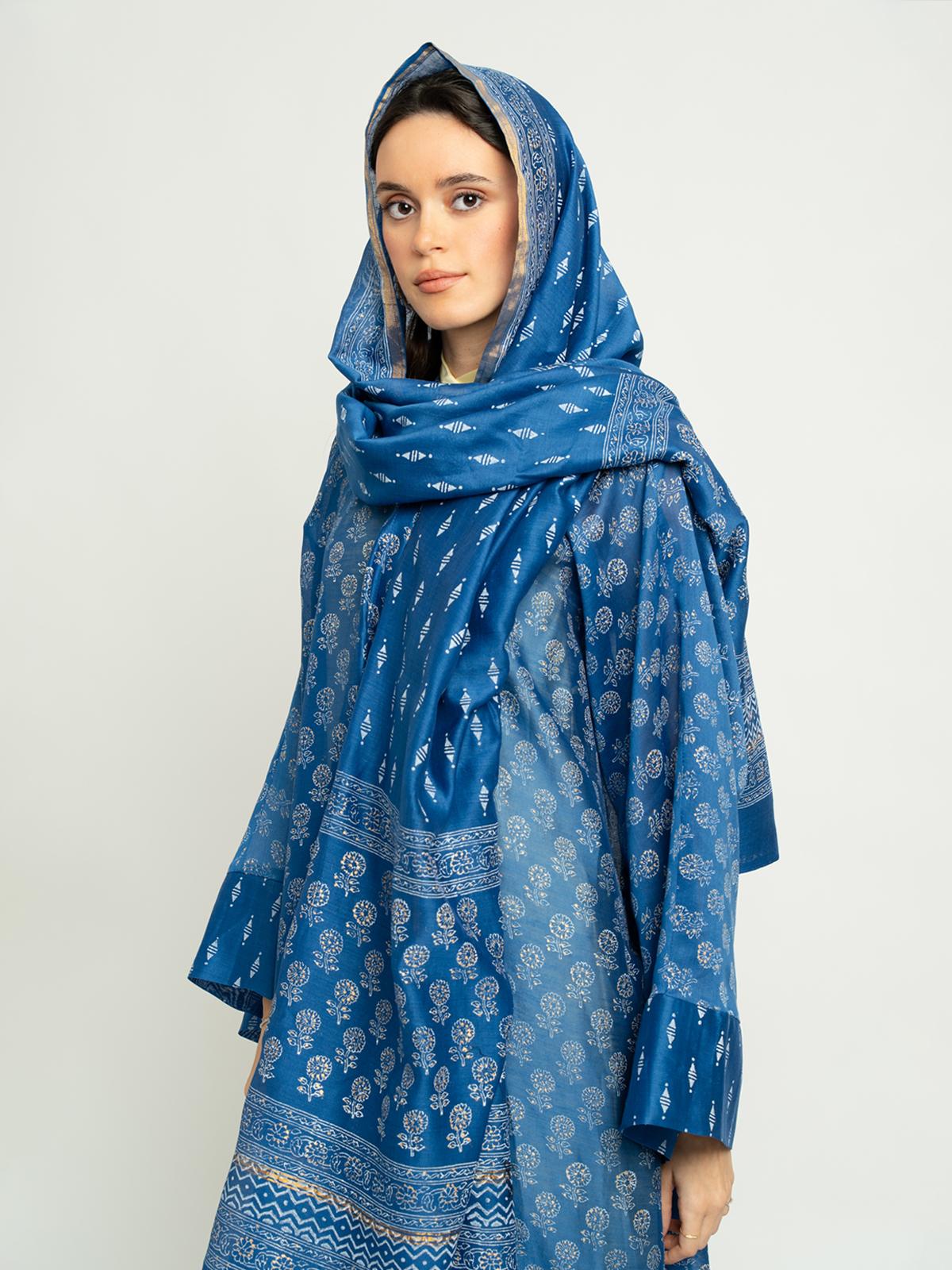 Wide-cut Printed Abaya in 100% Stiff Silk Fabric