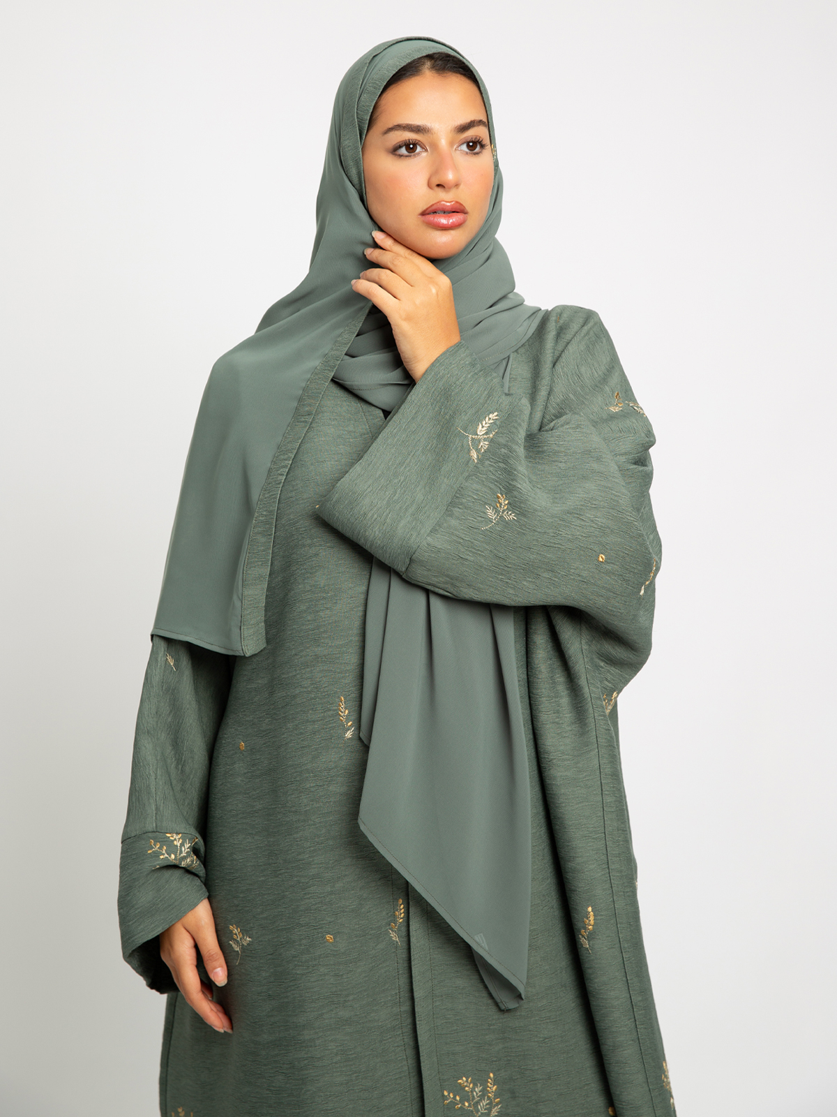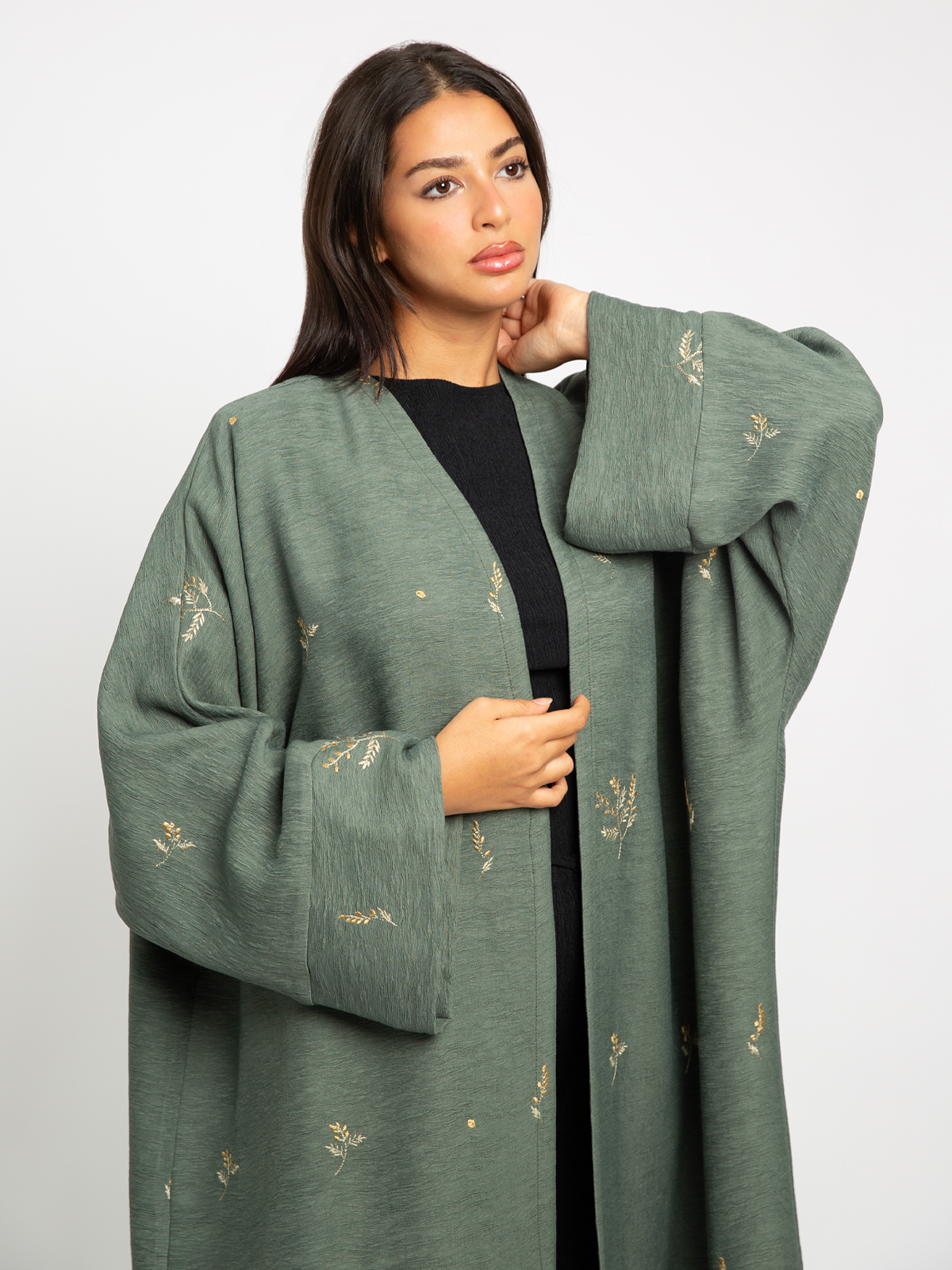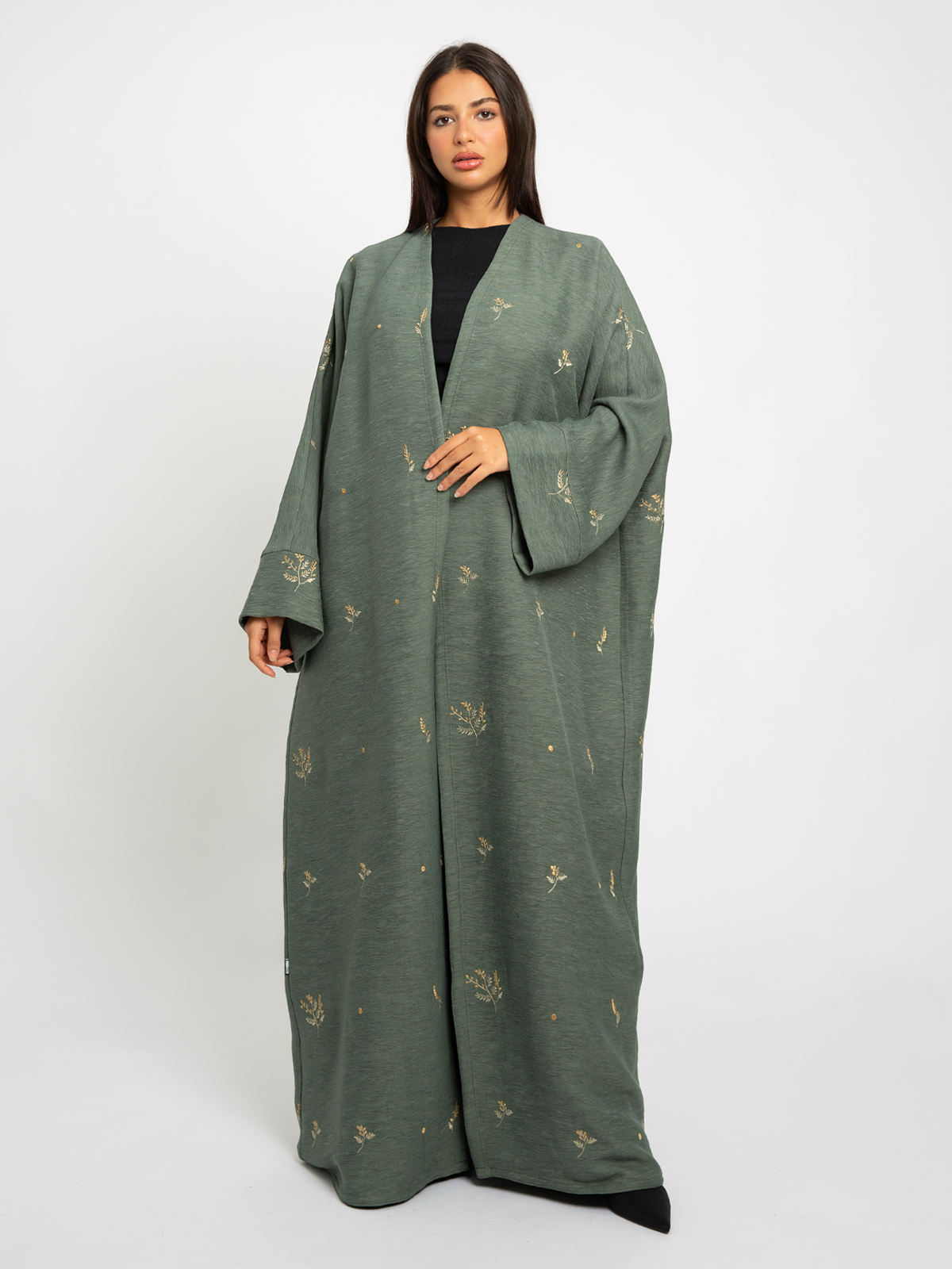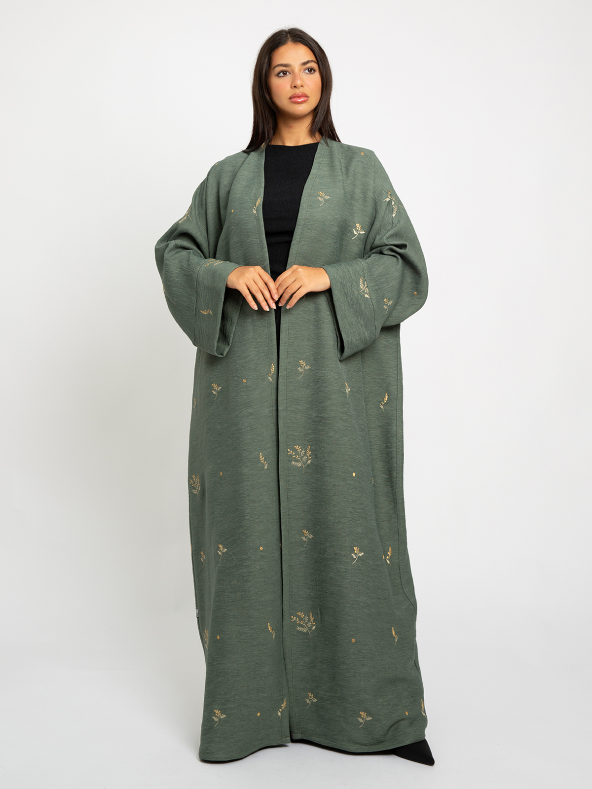 Wide-fit Long Open Abaya in Embroidered Thick Crepe Fabric
