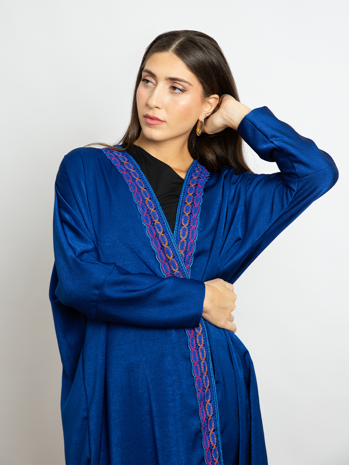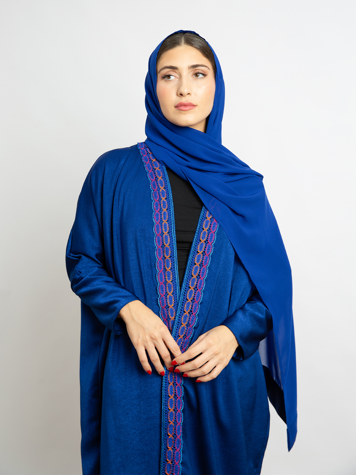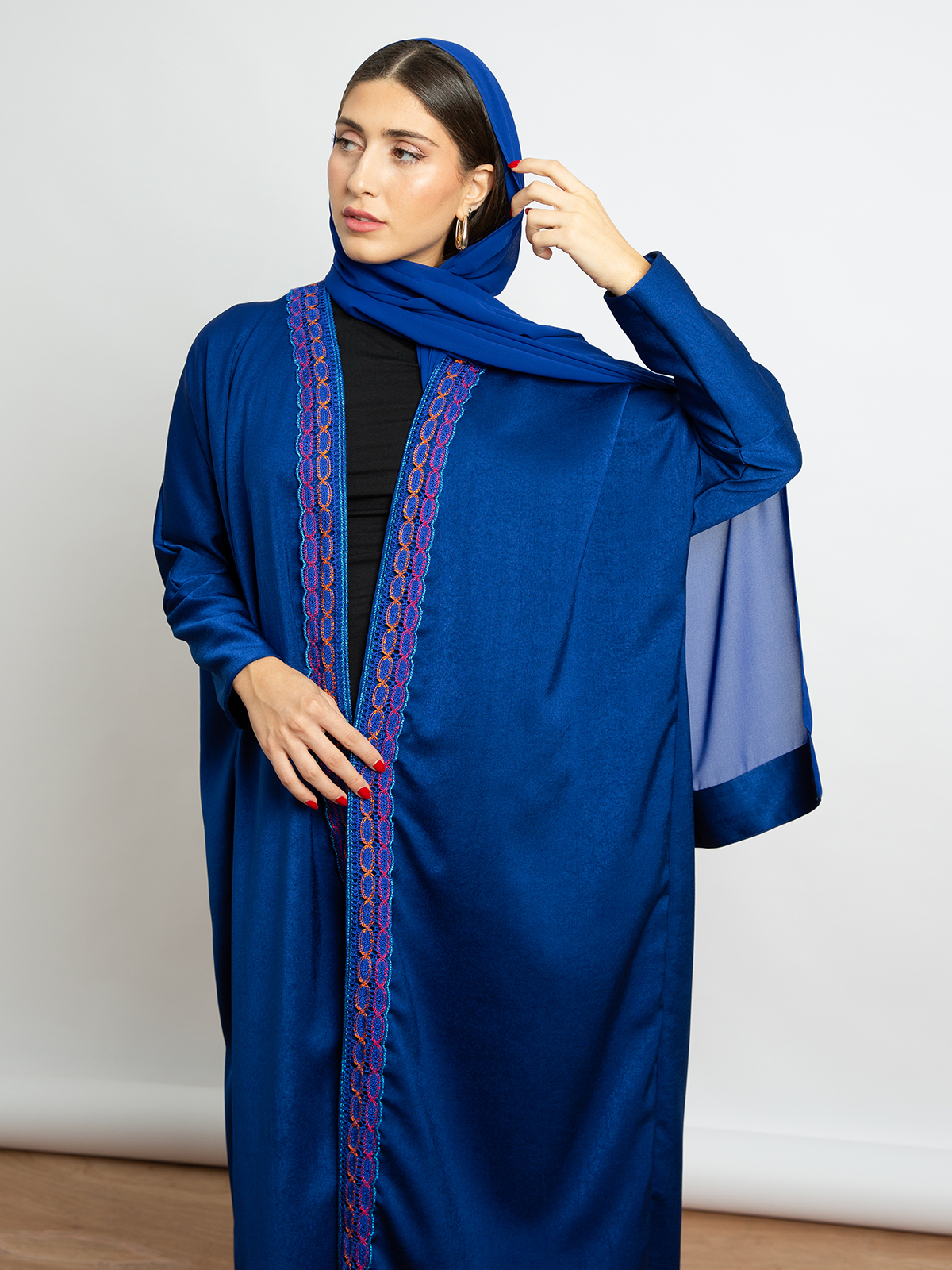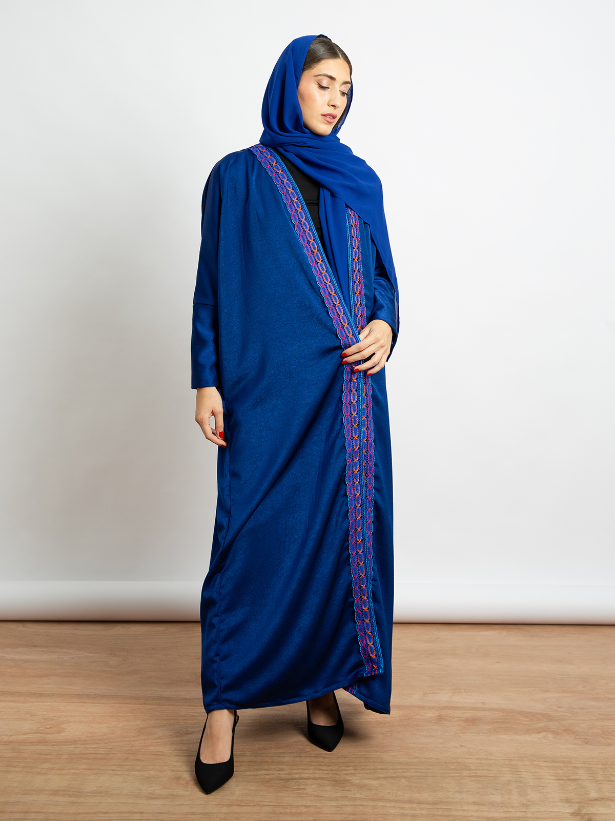 Indigo Blue with Colorful Art Piece - Half Bisht Long Open Abaya in Soft & Silky Fabric