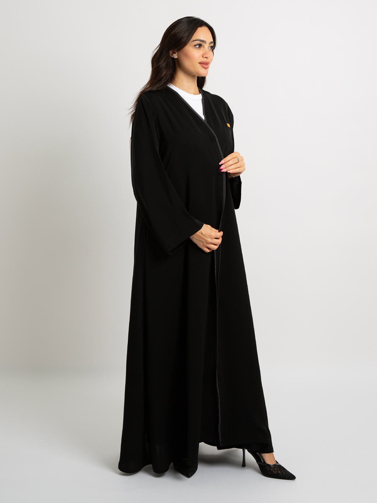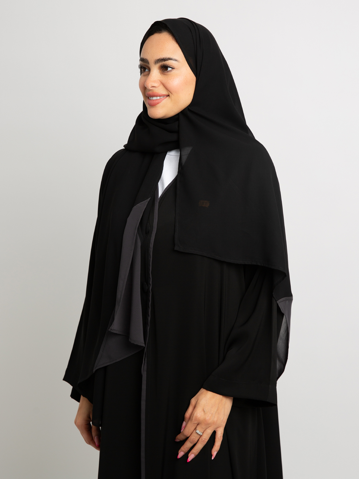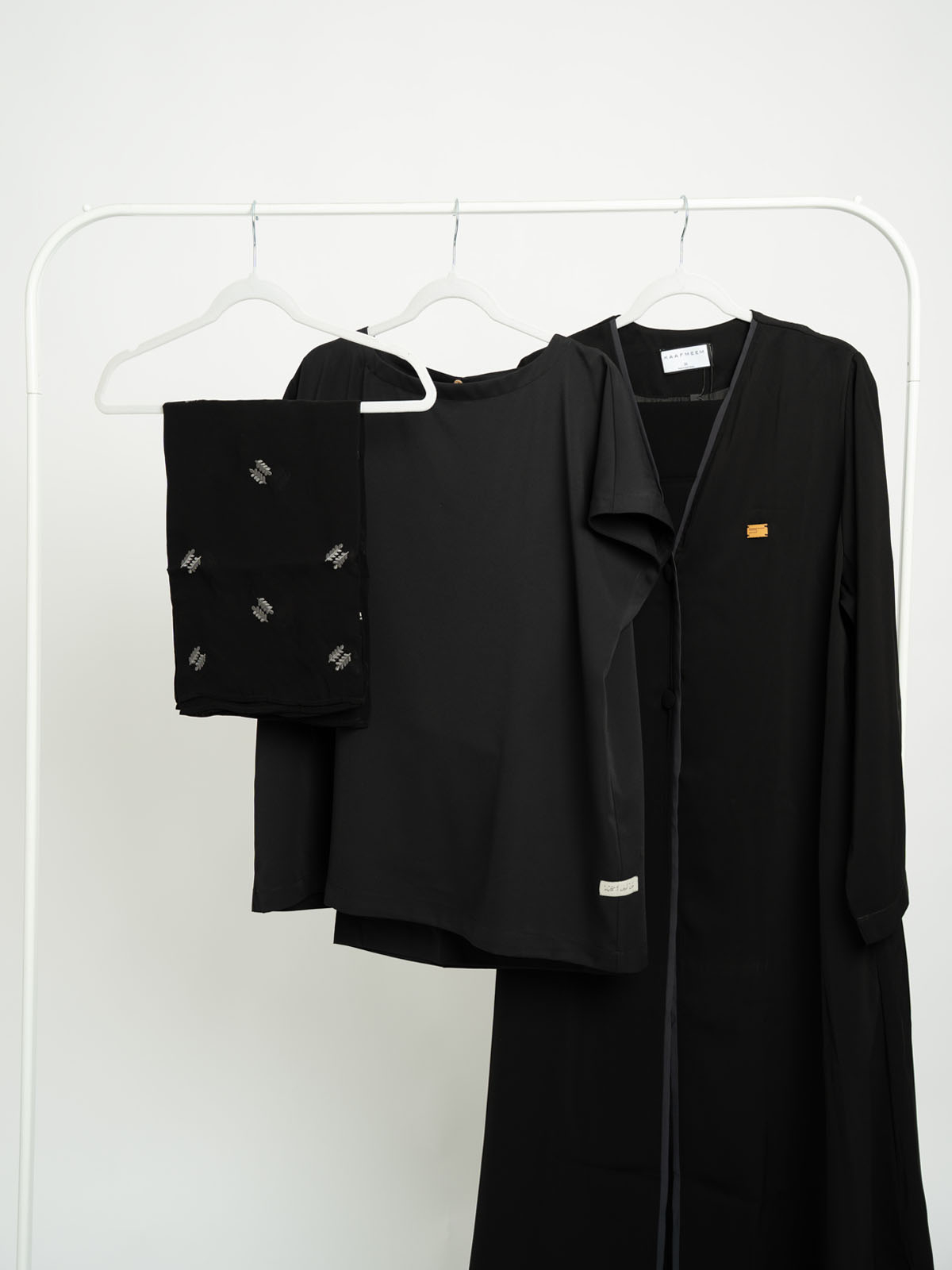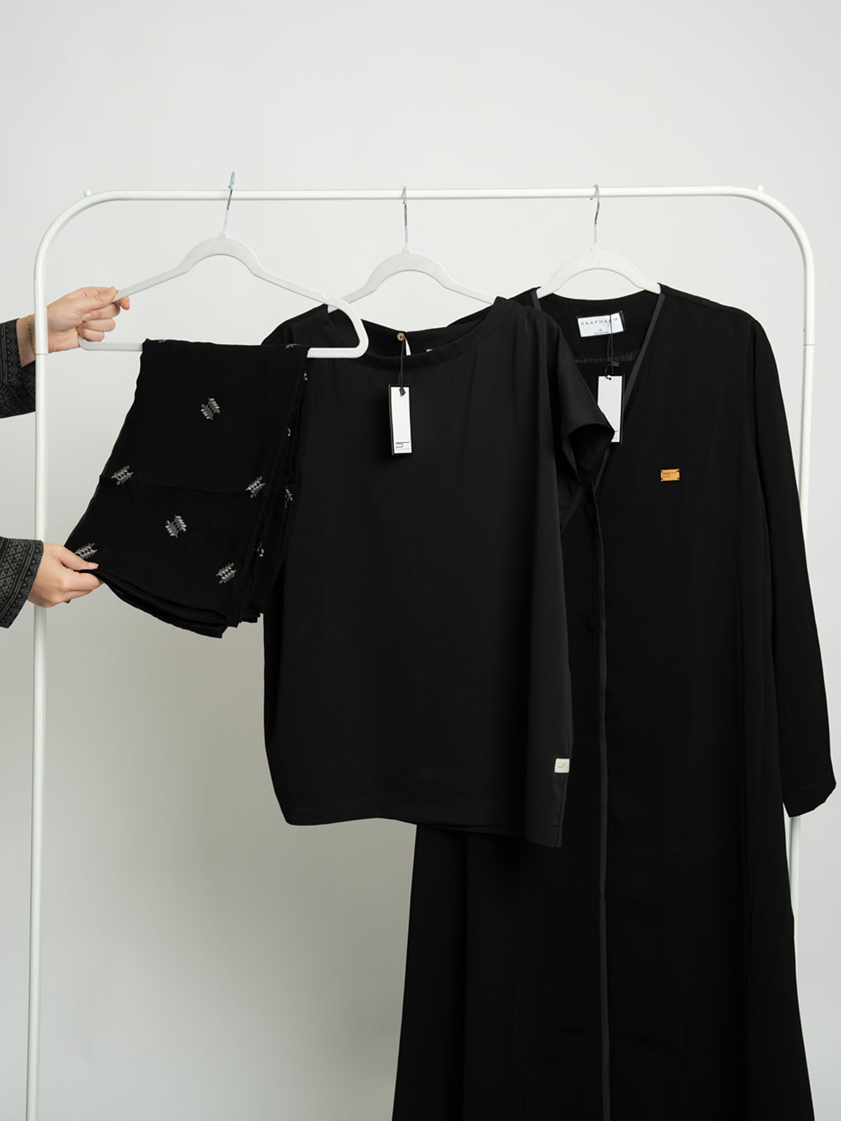 This package includes a black executive abaya, a black Sanabel laser tarha, and a black under-abaya light set, perfect for achieving a polished work look in minutes!