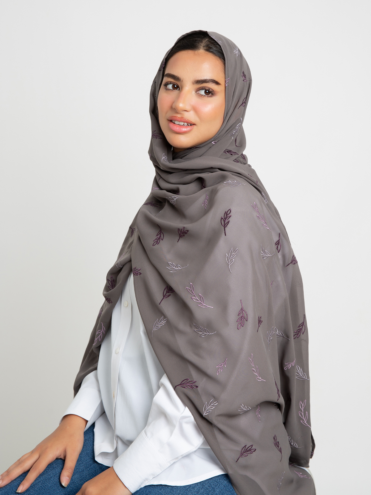 Hijab color: Titanium with Sprinkled Leaf Embroidery.