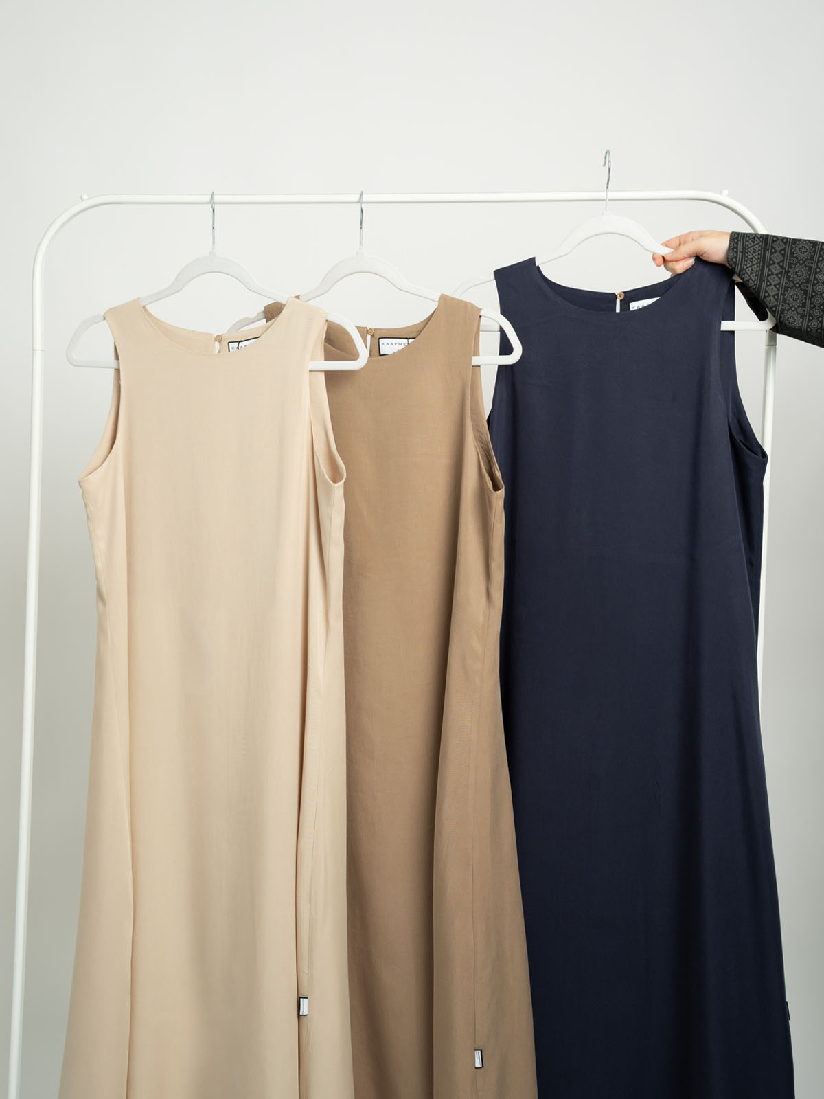 New saver package by kaafmeem includes 3 sleeveless under-abaya dresses made from 100% Tencel, lightweight, breathable, and comfortable for everyday wear.