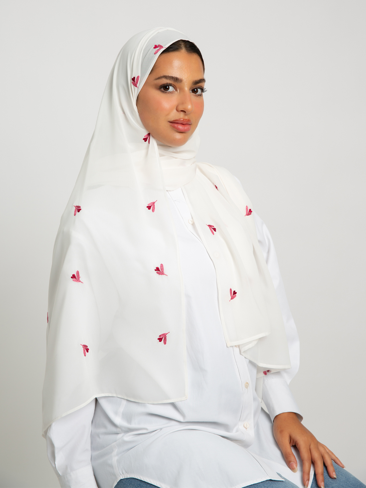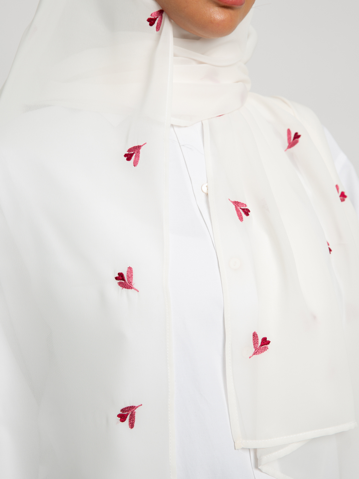 Hijab color: White Tarha with Heart Flower Embroidery.