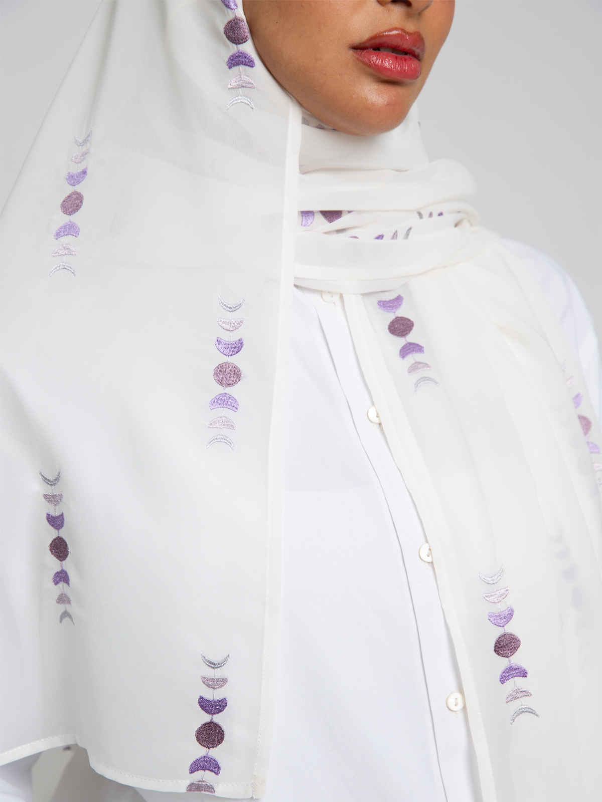 Elevate your look with a hijab that blends effortless elegance and all-day comfort. Made of breathable laser chiffon fabric. Our new moon embroidery adds a subtle glow to your look; perfect for quiet confidence and soft charm!
